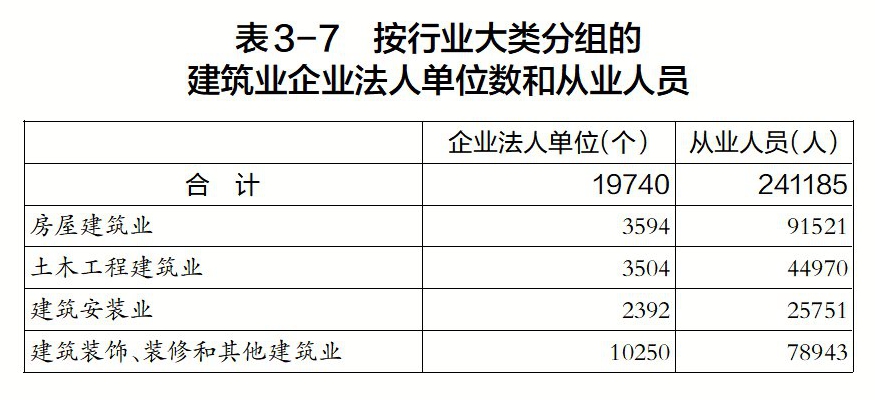 建筑業(yè)企業(yè)法人單位中,內(nèi)資企業(yè)19495個(gè),占98.8%;港澳臺(tái)投資企業(yè)241個(gè),占1.2%;外商投資企業(yè)4個(gè),占0.02%。