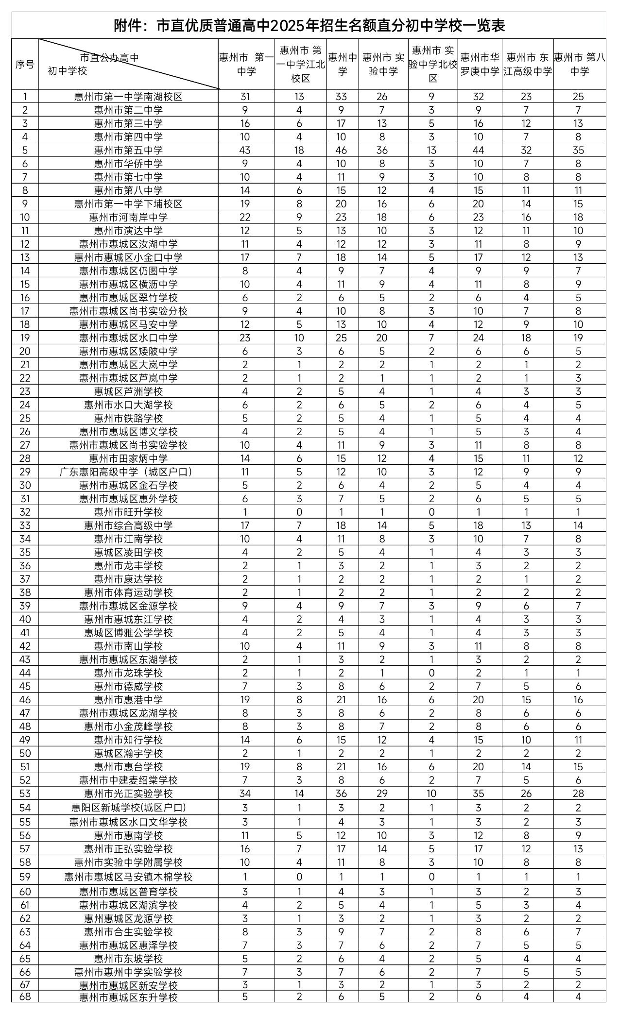 5月29日,惠州市教育局發(fā)布重要消息:2025年市直優(yōu)質(zhì)普通高中招生名額將繼續(xù)直接分配到全市初中學(xué)校(包括民辦學(xué)校)。簡(jiǎn)單來(lái)說(shuō),像惠州市第一中學(xué)、惠州中學(xué)、惠州市實(shí)驗(yàn)中學(xué)等這些市直優(yōu)質(zhì)高中,每年至少會(huì)拿出一半的招生名額,直接分配到各個(gè)初中。今年新招生的惠州市第一中學(xué)江北校區(qū)也在名額分配學(xué)校名單里。