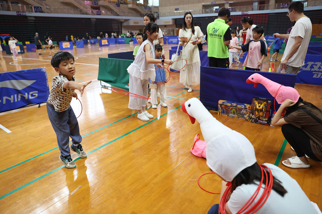 趣味體育嘉年華活動(dòng)包括個(gè)人通關(guān)類、親子通關(guān)類、團(tuán)體協(xié)作類、競賽類游戲等,圖為親子通關(guān)活動(dòng)。