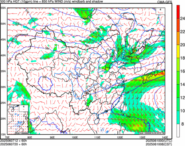 從風(fēng)場圖看,右下角“旋轉(zhuǎn)”起來的為臺風(fēng)。