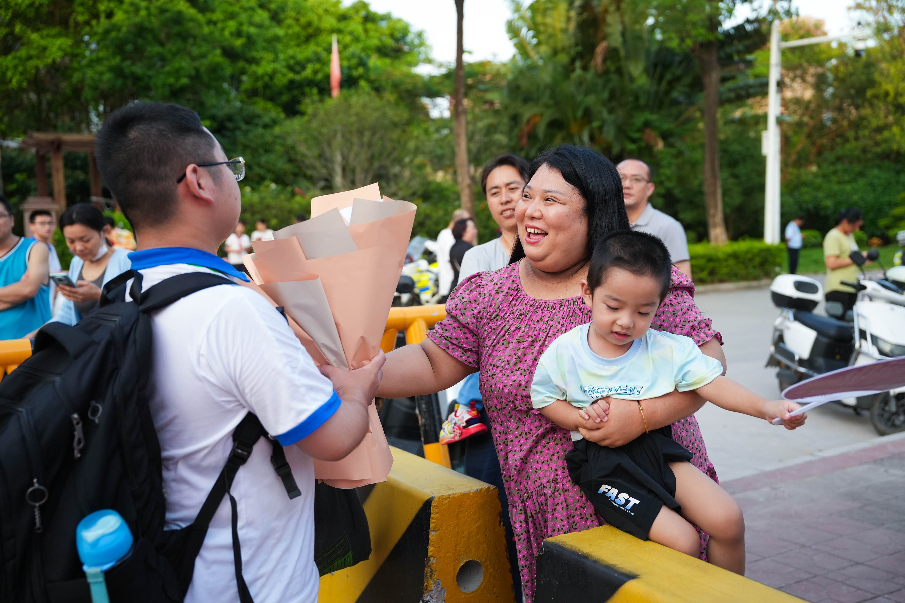 高考結(jié)束后,家長(zhǎng)向考生遞過(guò)鮮花。 惠州日?qǐng)?bào)記者黃旭新 攝