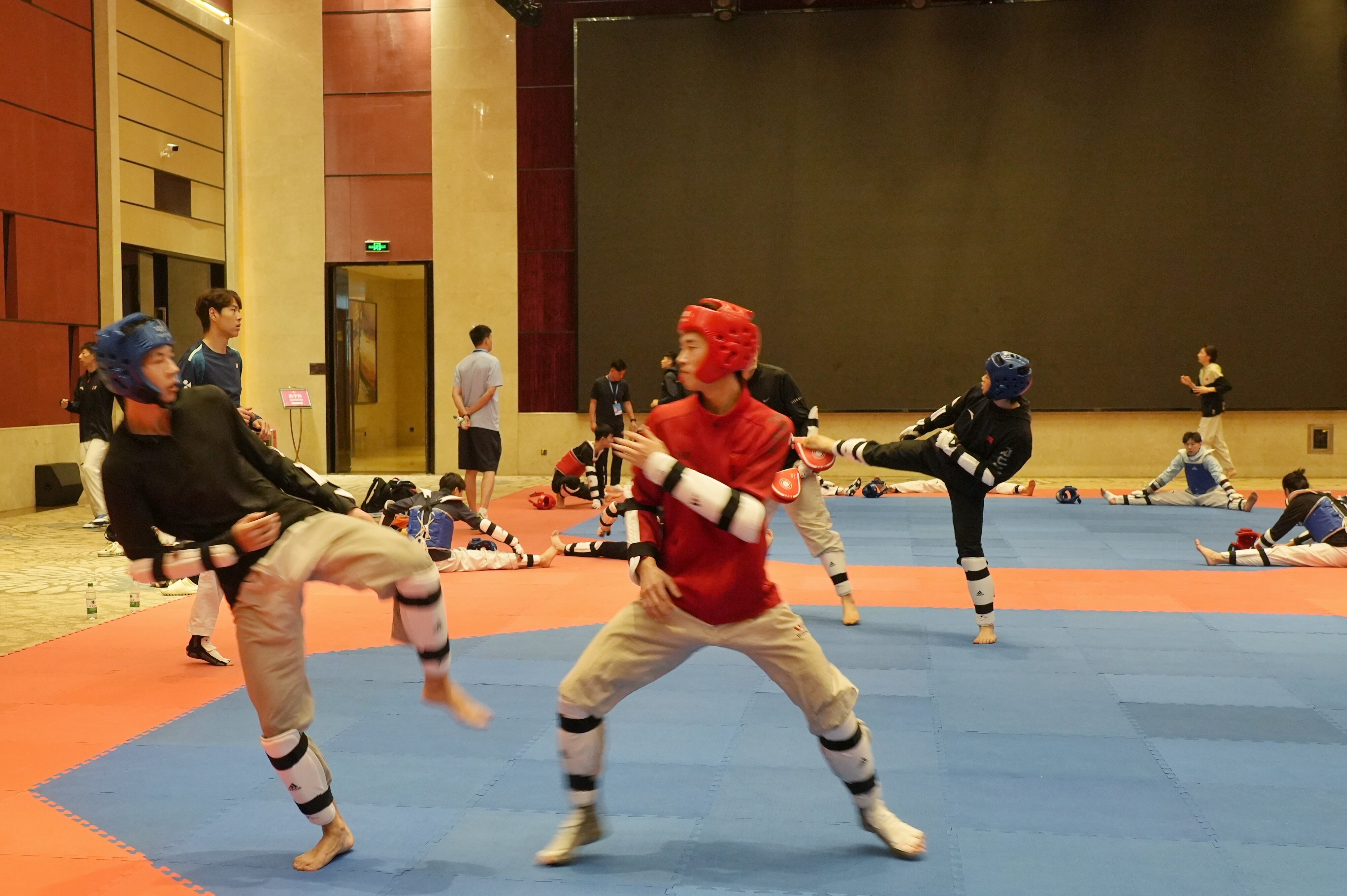 6月16日10時(shí),記者探訪運(yùn)動(dòng)員下榻的酒店。為提供更便利的訓(xùn)練條件,酒店將宴會(huì)廳臨時(shí)改造為訓(xùn)練室,鋪上厚厚的地毯。下劈、橫踢、旋風(fēng)踢……運(yùn)動(dòng)員們正緊張有序地進(jìn)行熱身訓(xùn)練,盡顯專業(yè)水準(zhǔn)。