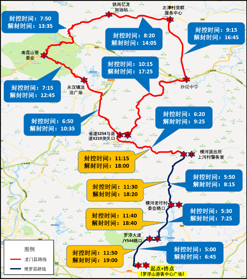 當日6:20-9:25,對省道S254(橫河派出所上河村警務(wù)室至省道S254與縣道X219交叉口段)進行臨時交通管制;6:50-10:35,對省道S254-縣道X229(省道S254與縣道X219交叉口至永漢鎮(zhèn)法治廣場段)進行臨時交通管制,同時封閉廣河高速永漢收費站進出口匝道,禁止車輛進出收費站;7:15-12:45,對縣道X229(永漢鎮(zhèn)法治廣場至南昆山管委會段)進行臨時交通管制;7:50-13:35,對縣道X222(南昆山管委會至鐵崗億龍加油站段)進行臨時交通管制,同時封閉汕湛高速南昆山收費站進出口匝道,禁止車輛進出收費站;8:20-14:05,對縣道X222(鐵崗億龍加油站至龍?zhí)舵?zhèn)左潭村黨群服務(wù)中心路口段)進行臨時交通管制;9:15-16:45,對縣道X218-國道G355(龍?zhí)舵?zhèn)左潭村黨群服務(wù)中心至沙逕中學(xué)段)進行臨時交通管制;10:15-17:25,對國道G355-縣道X219(沙逕中學(xué)至省道S254與縣道X219交叉口段)進行臨時交通管制;11:15-18:00,對省道S254(省道S254與縣道X219交叉口至橫河派出所上河村警務(wù)室段)進行臨時交通管制。