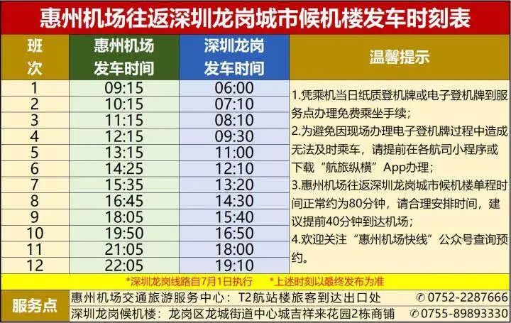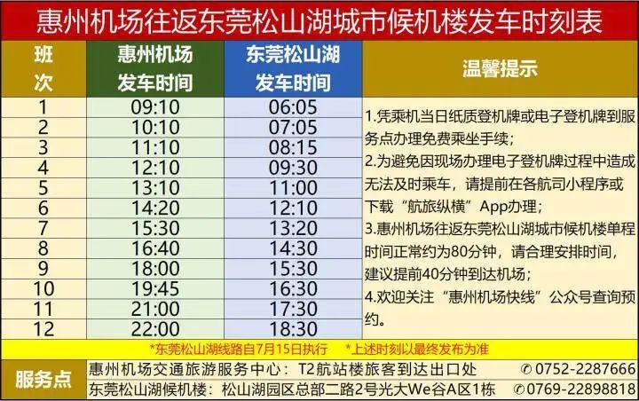 乘機當日,旅客憑紙質或電子登機牌在惠州機場交通旅游服務中心(招呼站)及深圳龍崗、東莞松山湖城市候機樓辦理乘車手續(xù)后,即可免費乘坐線路車輛。深圳龍崗、東莞松山湖線路每日各安排24班次往返惠州機場,發(fā)車密度滿足旅客需求。
