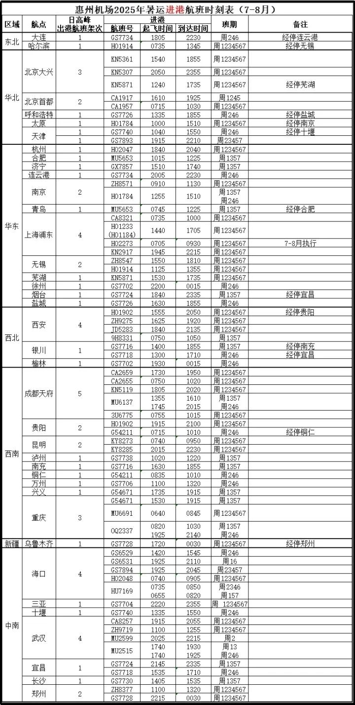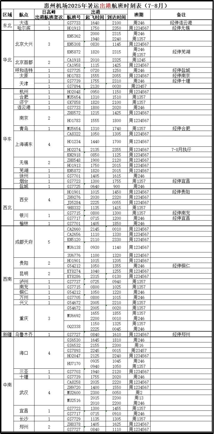 2025年暑運期間,惠州機場共有15家航司運營51條航線,通航38個城市,通航點除覆蓋北京、上海、成都、重慶、西安、烏魯木齊、呼和浩特、三亞等主要省會城市,還開通了如連云港、徐州、煙臺、鹽城、榆林、瀘州、萬州、十堰、銅仁等支線機場城市。