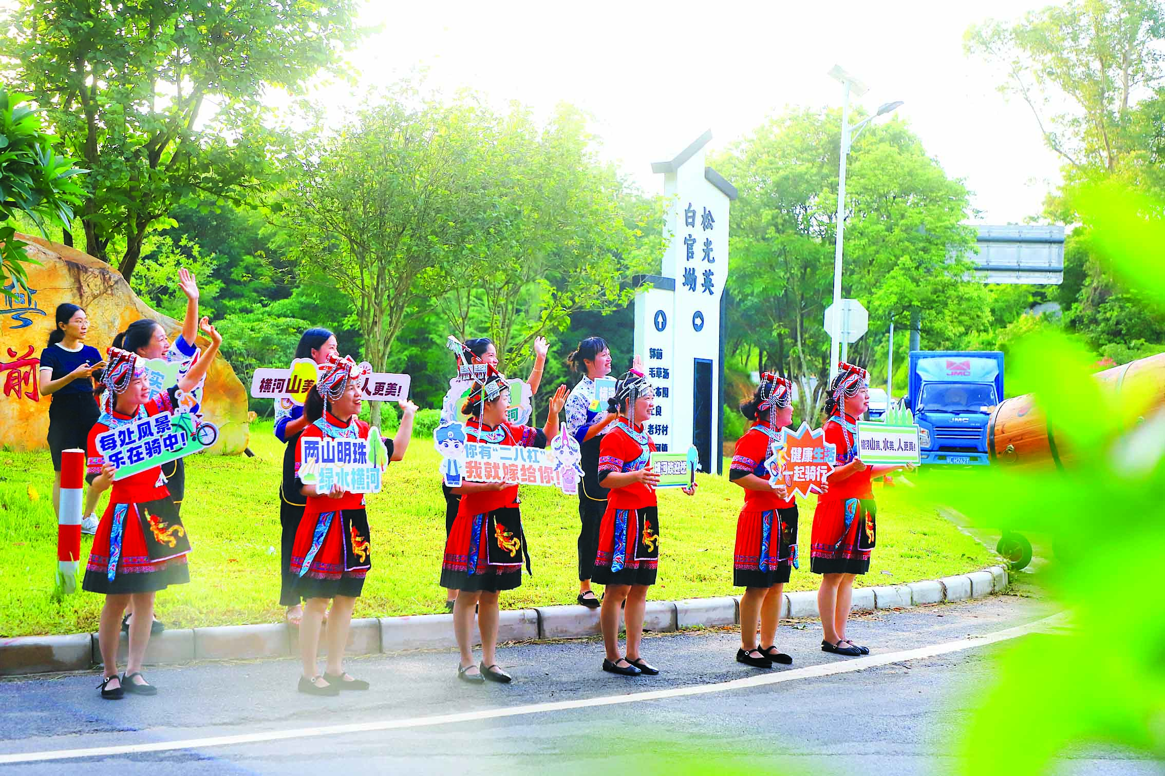 身著畬族服飾、客家服飾的村民站在路邊給騎友們加油鼓勁。