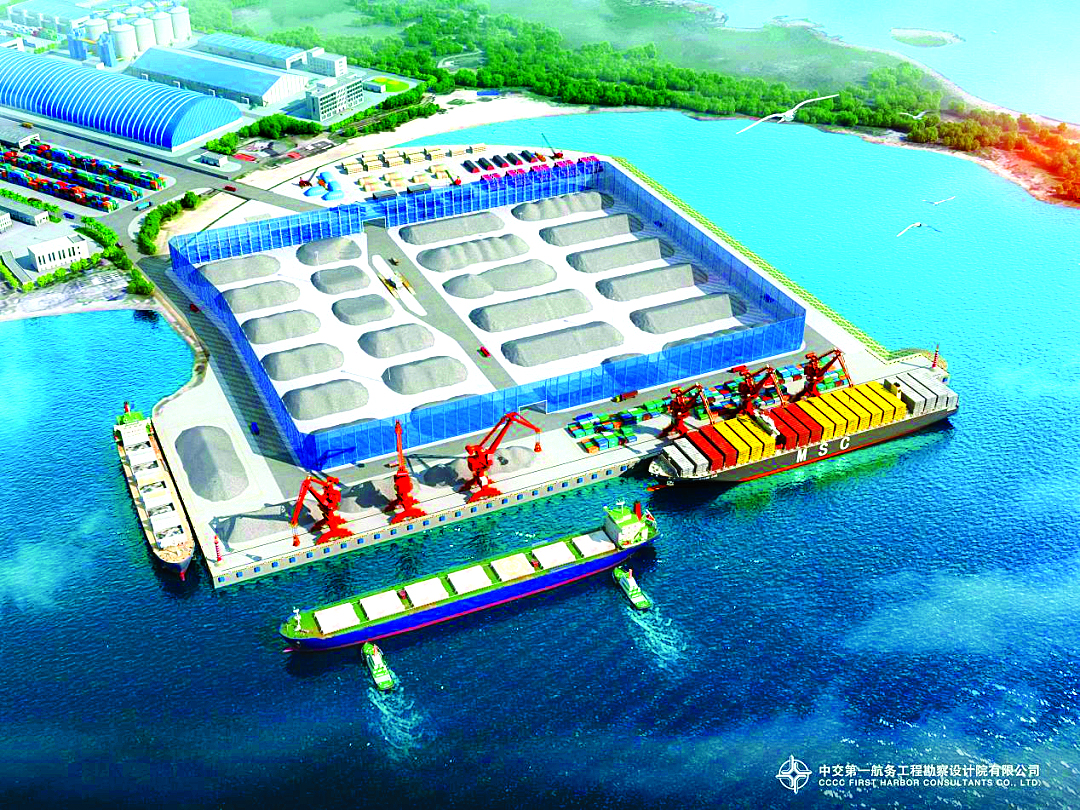 該項目擬建設(shè)1個7萬噸級和1個2萬噸級多用途泊位(結(jié)構(gòu)均按靠泊7萬噸級散貨船設(shè)計),岸線長度477.8米,項目設(shè)計年吞吐量830萬噸,其中散雜貨730萬噸,集裝箱10萬標箱。第一批建設(shè)內(nèi)容主要包括陸域形成與水工建筑物。圖為碼頭效果圖;葜萑請笥浾咴o妍 翻拍