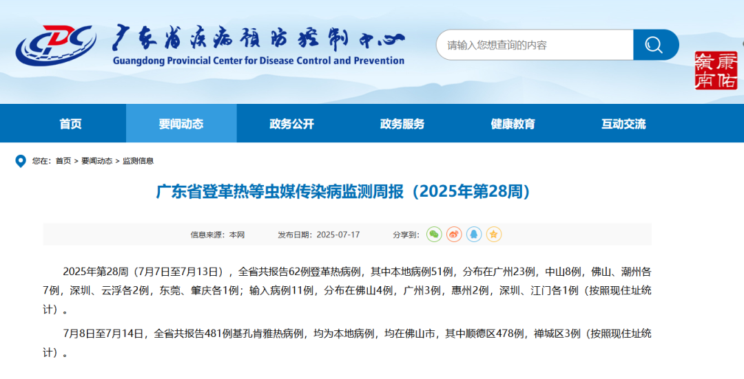據(jù)廣東省疾病預(yù)防控制中心網(wǎng)站發(fā)布廣東省登革熱等蟲(chóng)媒傳染病監(jiān)測(cè)周報(bào)(2025年第28周)顯示,2025年第28周(7月7日至7月13日),全省共報(bào)告62例登革熱病例,其中本地病例51例,分布在廣州23例,中山8例,佛山、潮州各7例,深圳、云浮各2例,東莞、肇慶各1例;輸入病例11例,分布在佛山4例,廣州3例,惠州2例,深圳、江門各1例(按照現(xiàn)住址統(tǒng)計(jì))。