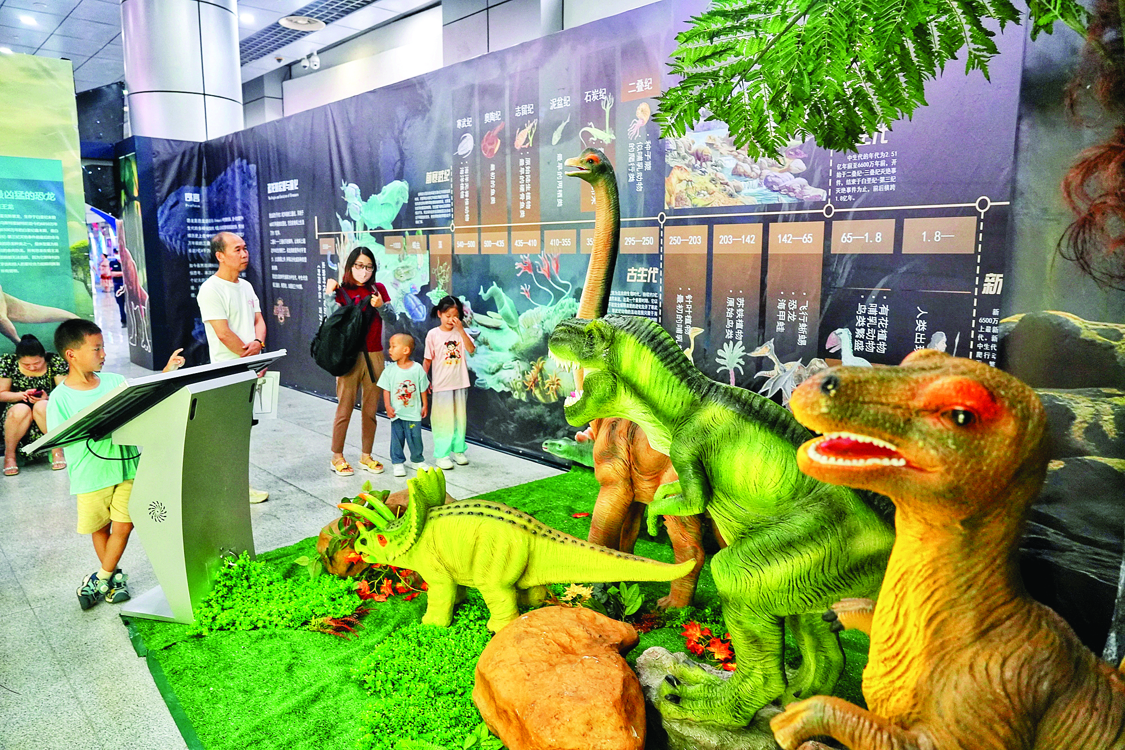 “這樣的主題展特別有趣!孩子們很好奇,大家既能系統(tǒng)學(xué)習(xí)恐龍相關(guān)知識(shí),還可以深度參與體驗(yàn),感受遠(yuǎn)古時(shí)代的風(fēng)貌!笔忻駝⑾壬鷰е鴥蓚(gè)孩子前來參觀展覽,只見他一邊為孩子拍照打卡,一邊認(rèn)真講解恐龍相關(guān)科普知識(shí)。