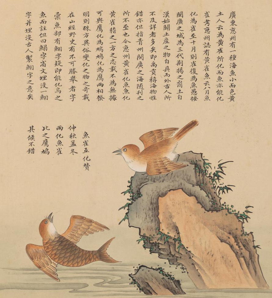 《海錯(cuò)圖》記載了不少與惠州有關(guān)的物種故事,如書(shū)中一篇《雀魚(yú)互化》寫(xiě)道:“廣東惠州有一種海魚(yú),小而色黃,土人云為黃雀所化,而魚(yú)亦能化雀,考《惠州志》有黃雀魚(yú),云八月魚(yú)化為雀,至十月則雀復(fù)為魚(yú)!甭欒锌=、廣東一帶有很多土特產(chǎn),古人都不曾詳細(xì)記載過(guò),如《尚書(shū)·禹貢》描述的“海物惟錯(cuò)”,就沒(méi)有將福建、廣東沿海土特產(chǎn)囊括進(jìn)去!敖窕葜蔹S雀化魚(yú)、魚(yú)化黃雀,稽之一方之志載,不為無(wú)據(jù),可與鷹化為鳩、鳩化為鷹兩相發(fā)明,則殊方異俗,變化之物之奇,載在山經(jīng)野史,有不可勝舉者。”聶璜還寫(xiě)詩(shī)《魚(yú)雀互化贊》云:“仲秋孟冬,兩化魚(yú)雀。比之鷹鳩,其候不錯(cuò)!