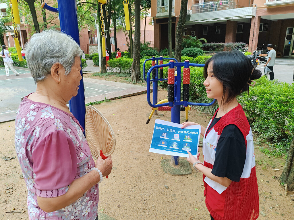 “奶奶,你們出門鍛煉時要做好防蚊措施,要噴防蚊藥水!睂W生志愿者劉家宜遇到在小區(qū)鍛煉的長者,熱情地上前向他們介紹防蚊要領(lǐng)。