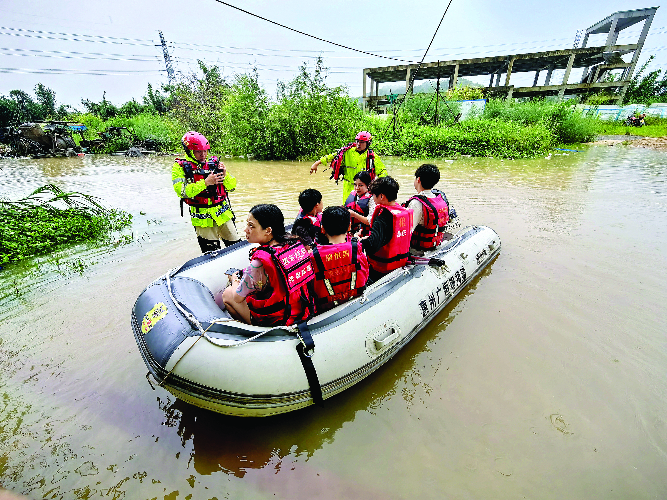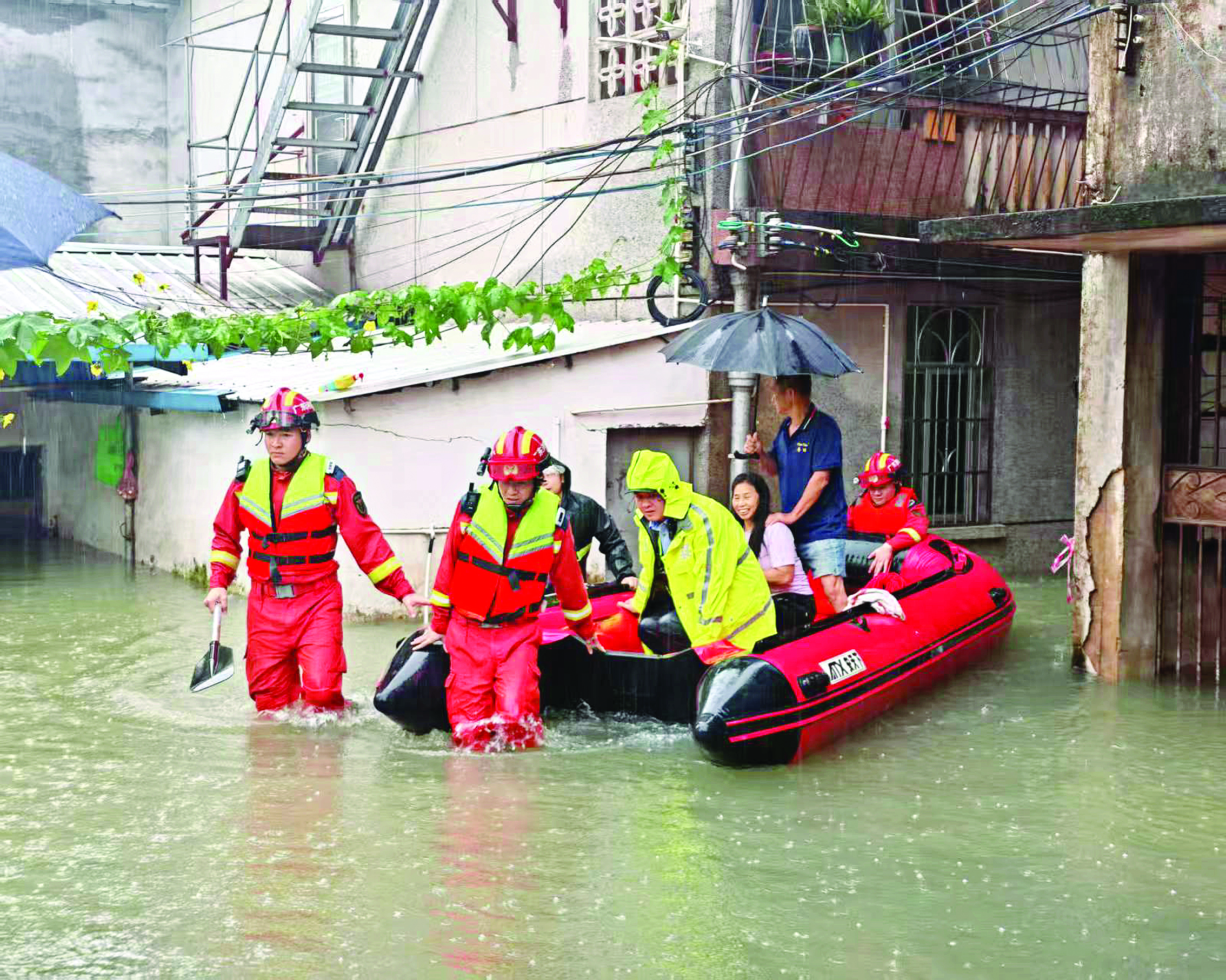 藍(lán)天救援隊(duì)在惠陽淡水街道橋背街轉(zhuǎn)移需要救援的一家四口。 惠州日報記者謝寶樹 攝