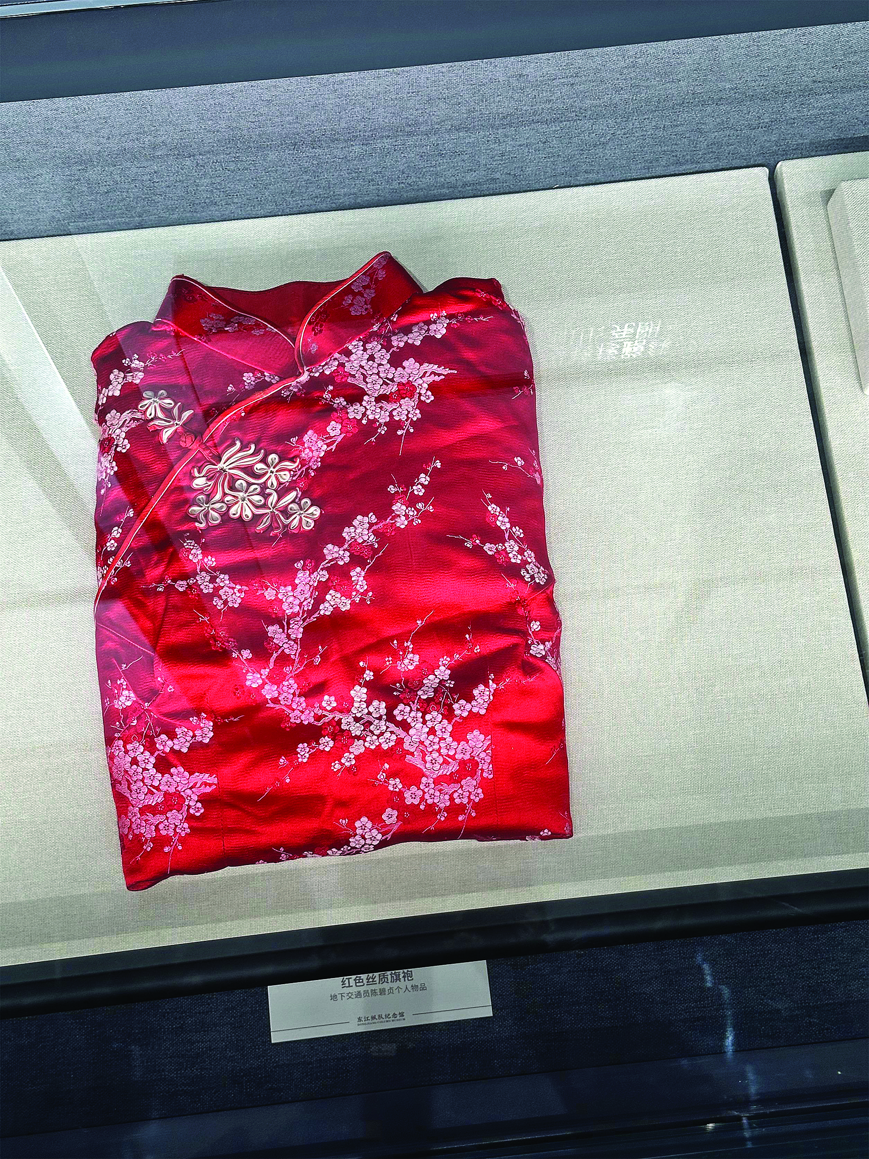在館內(nèi)的展柜中,一襲紅色絲質(zhì)旗袍靜靜陳列。燈光透過玻璃灑在緞面上,熾烈的紅如同跳動的火焰,旗袍上朵朵梅花刺繡傲然綻放,輝映著東縱戰(zhàn)士堅(jiān)定的革命信仰。在那個戰(zhàn)火紛飛的年代里,這不是普通的服飾,而是穿在戰(zhàn)士身上的“情報戰(zhàn)袍”。