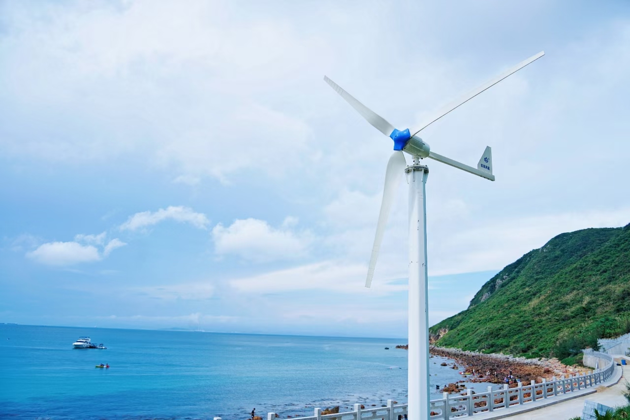 惠州供電局在三門島建設(shè)的風(fēng)力發(fā)電機(jī)與海島生態(tài)環(huán)境融為一體。