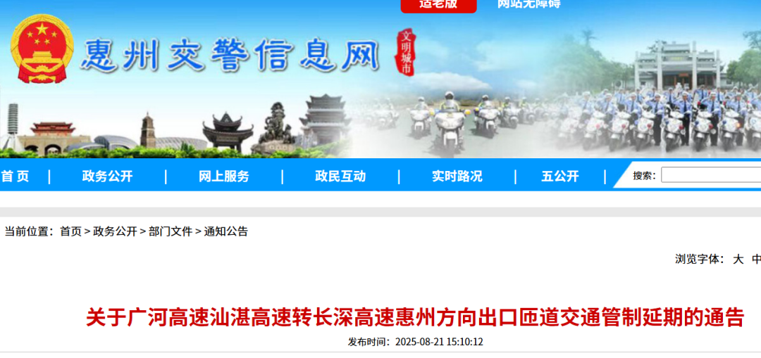 廣河高速、汕湛高速轉(zhuǎn)長深高速惠州方向出口匝道封閉施工,禁止車輛通行。交通管制時(shí)間延期至2025年8月31日10:00。
