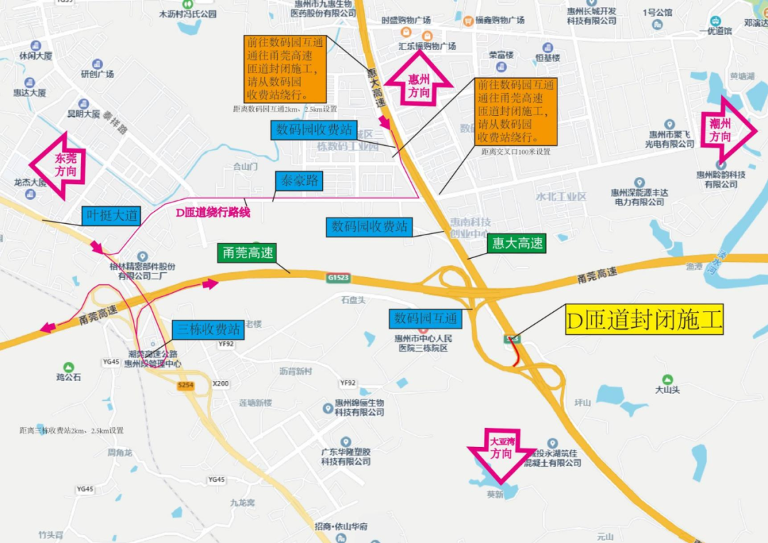 (一)數(shù)碼園互通D匝道:由2025年8月18日10:00延至2025年8月25日18:30,惠大高速公路(往大亞灣方向)接入甬莞高速公路(往東莞、汕頭方向)的匝道封閉,禁止車輛通行。(見圖1)