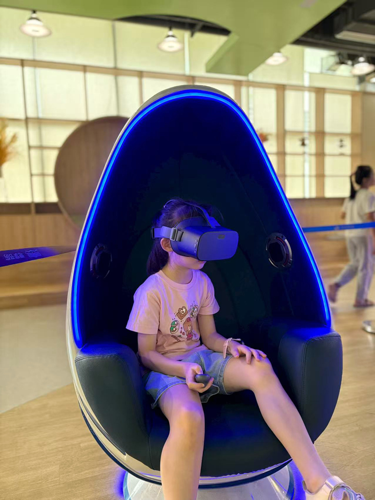 VR蛋殼椅為深度體驗(yàn)活動(dòng),受到青少年追捧,其核心亮點(diǎn)在于獨(dú)特的“蛋殼椅”體驗(yàn)艙。這些設(shè)計(jì)前衛(wèi)、符合人體工學(xué)的蛋殼形座椅,為參與者提供了極致的舒適與包裹感,有效隔絕外界干擾。當(dāng)你坐進(jìn)蛋殼椅,戴上VR設(shè)備的那一刻,仿佛進(jìn)入了一個(gè)專(zhuān)屬于你的“故事穿梭艙”。經(jīng)典名著中那些令人神往的場(chǎng)景,奇幻的、歷史的、科幻的世界將以360度全景、逼真可交互的形式在眼前生動(dòng)展開(kāi)。