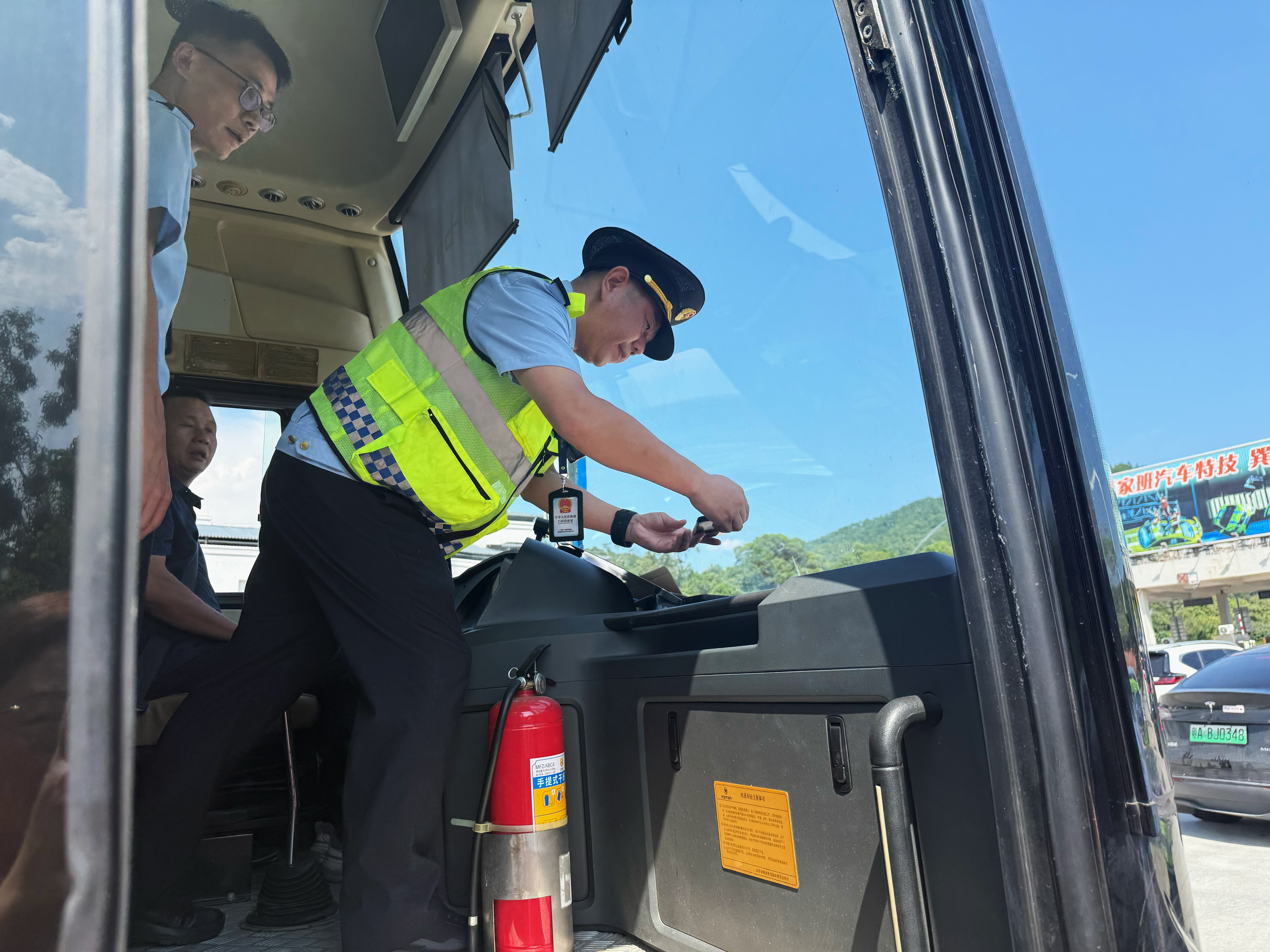 “請出示你的導(dǎo)游證”“有簽訂旅行合同嗎”……當(dāng)天下午3時(shí),在巽寮灣高速出入口,執(zhí)法人員對過往的旅游包車逐一排查,在檢查過程中,發(fā)現(xiàn)有車輛疑似出現(xiàn)證照不全的情況。