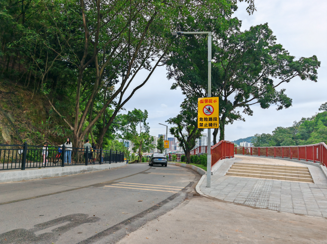 東門棧橋建成后,實(shí)現(xiàn)人車分流。棧橋兩側(cè)有“危險路段,禁止騎行”等溫馨提示牌。