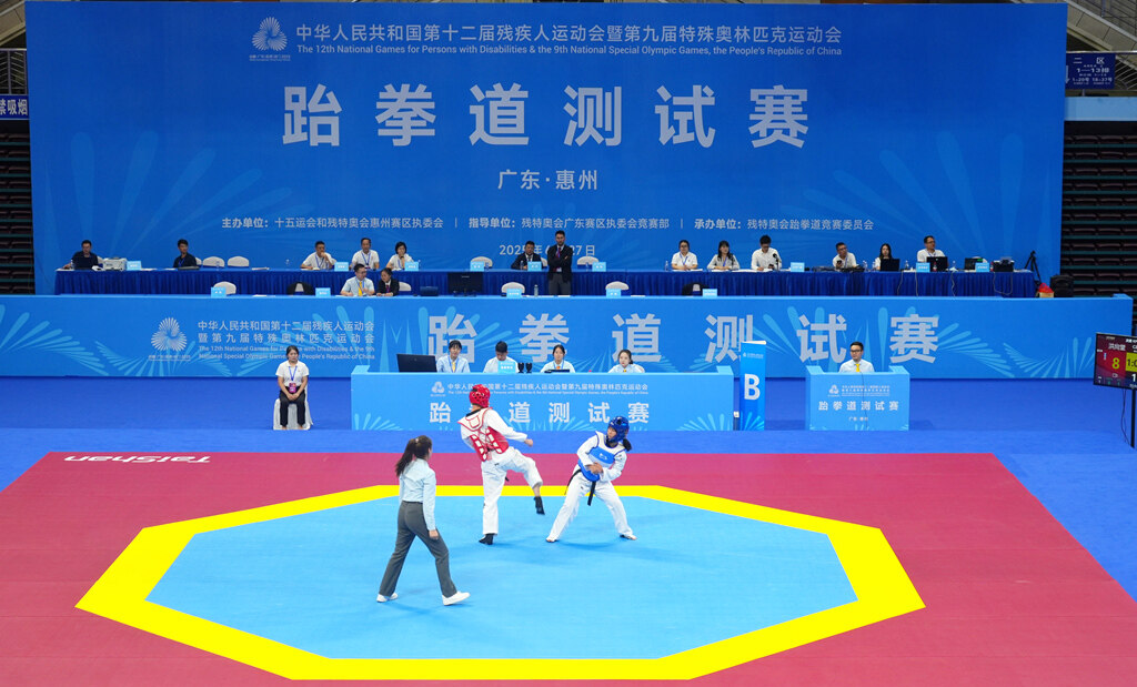 全國第十二屆殘疾人運動會暨第九屆特殊奧林匹克運動會跆拳道測試賽現(xiàn)場。惠州東江圖片社供圖