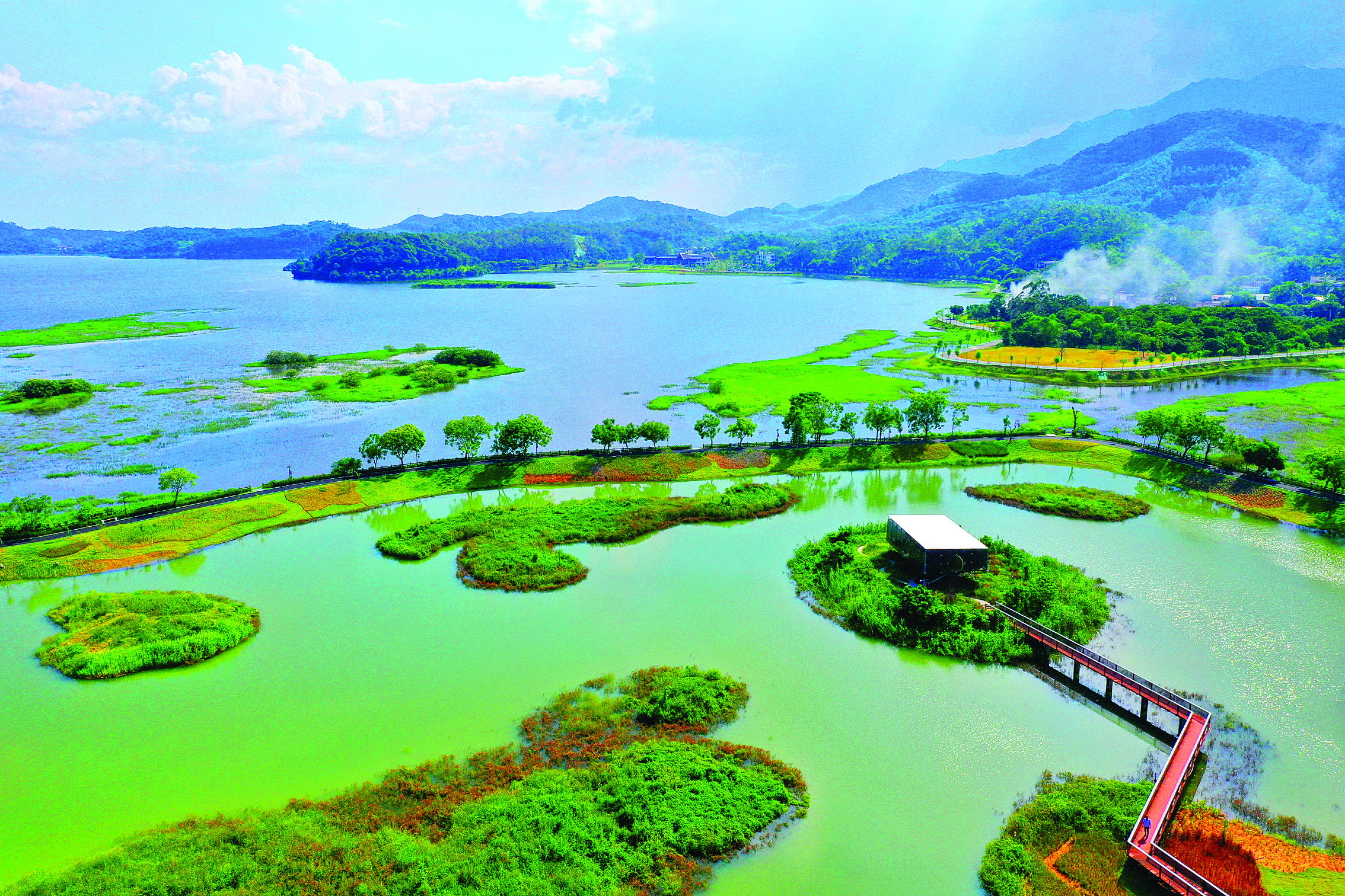 在顯崗水庫旁的湖心島上,“明月塢”藝術(shù)裝置設(shè)計風格引人注目;葜萑請笥浾咧旖鹳 攝