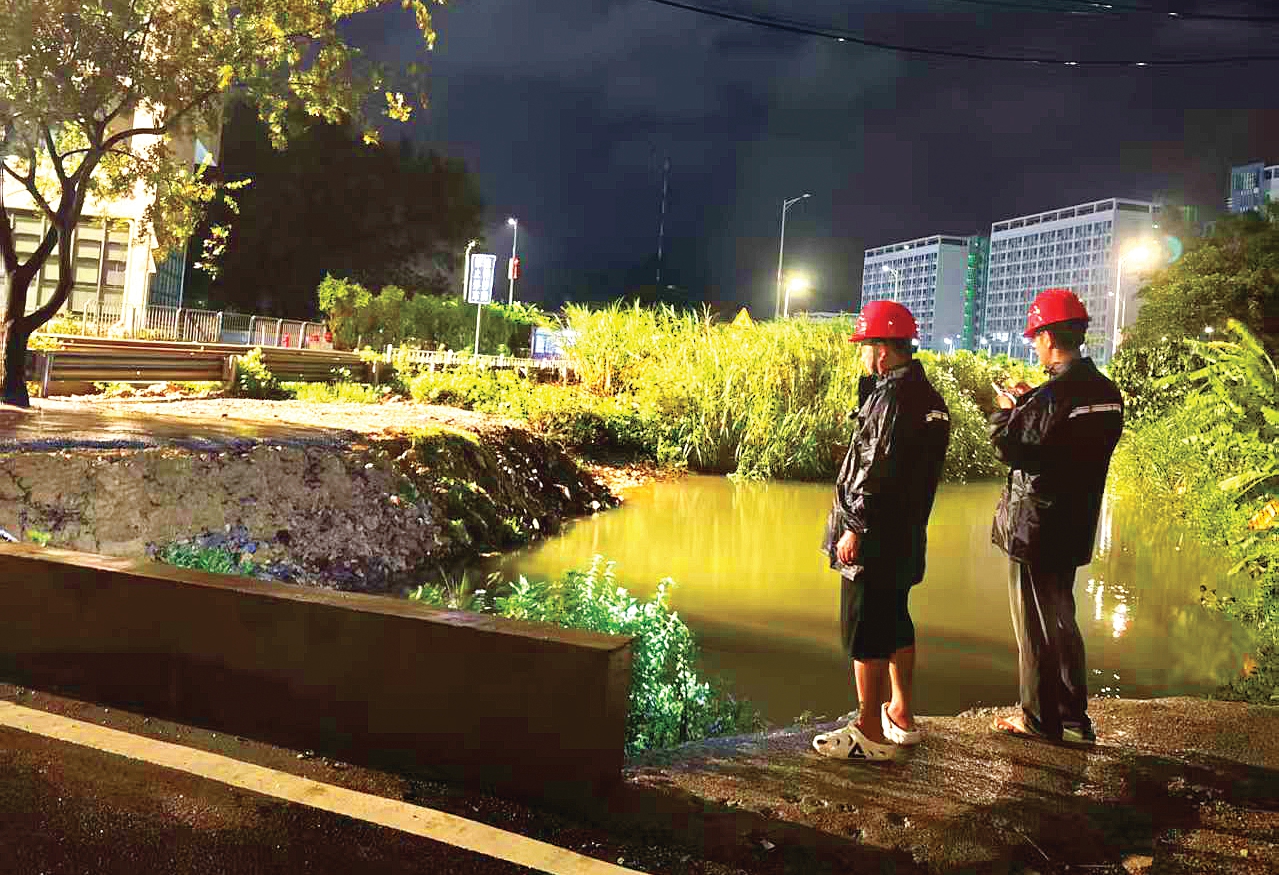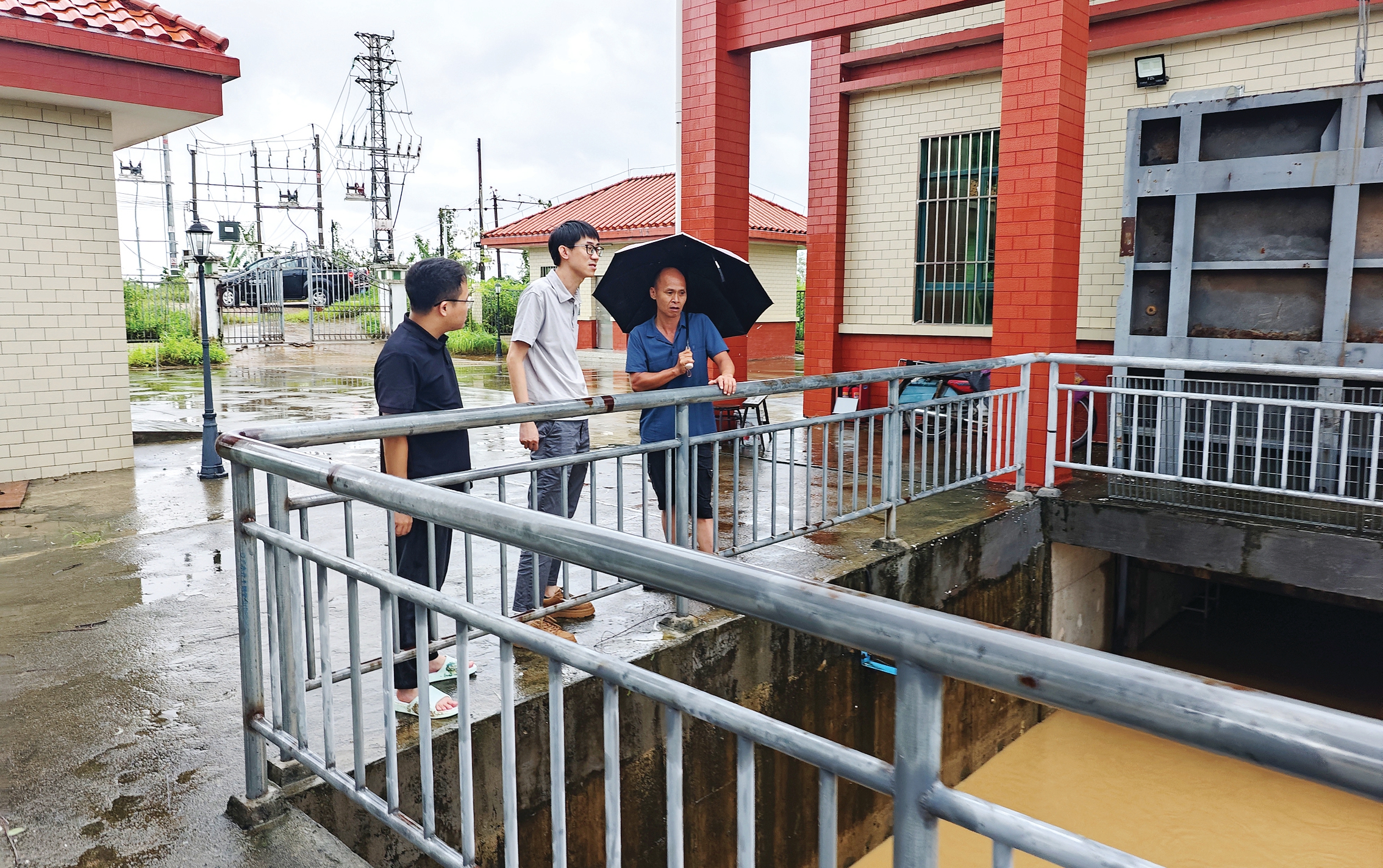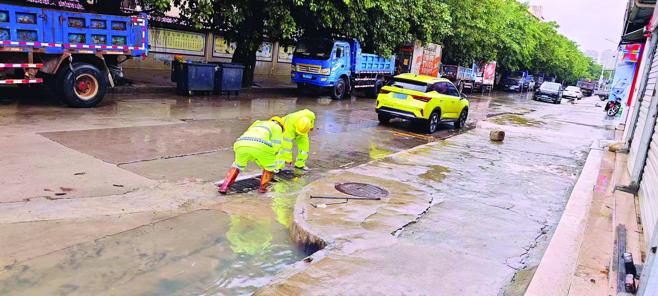 排澇人員及時(shí)疏排積水;葜萑請(bào)記者謝菁菁 特約通訊員黎華容 通訊員陳巧梅 攝