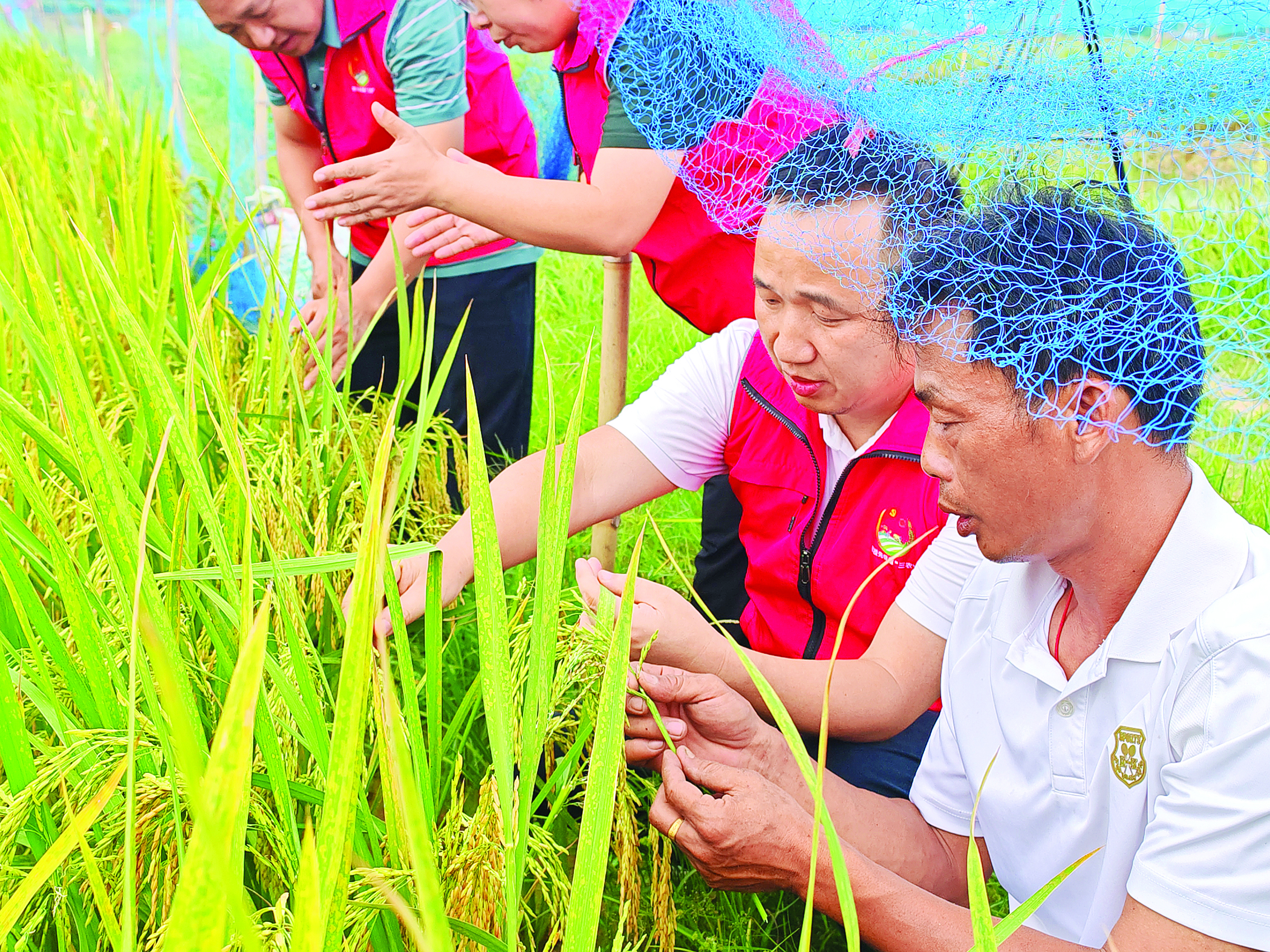 王暢新(右一)在農技部門支持下,擴大旱稻種植面積,示范種植水稻新品種。 惠州日報記者陳春惠 攝