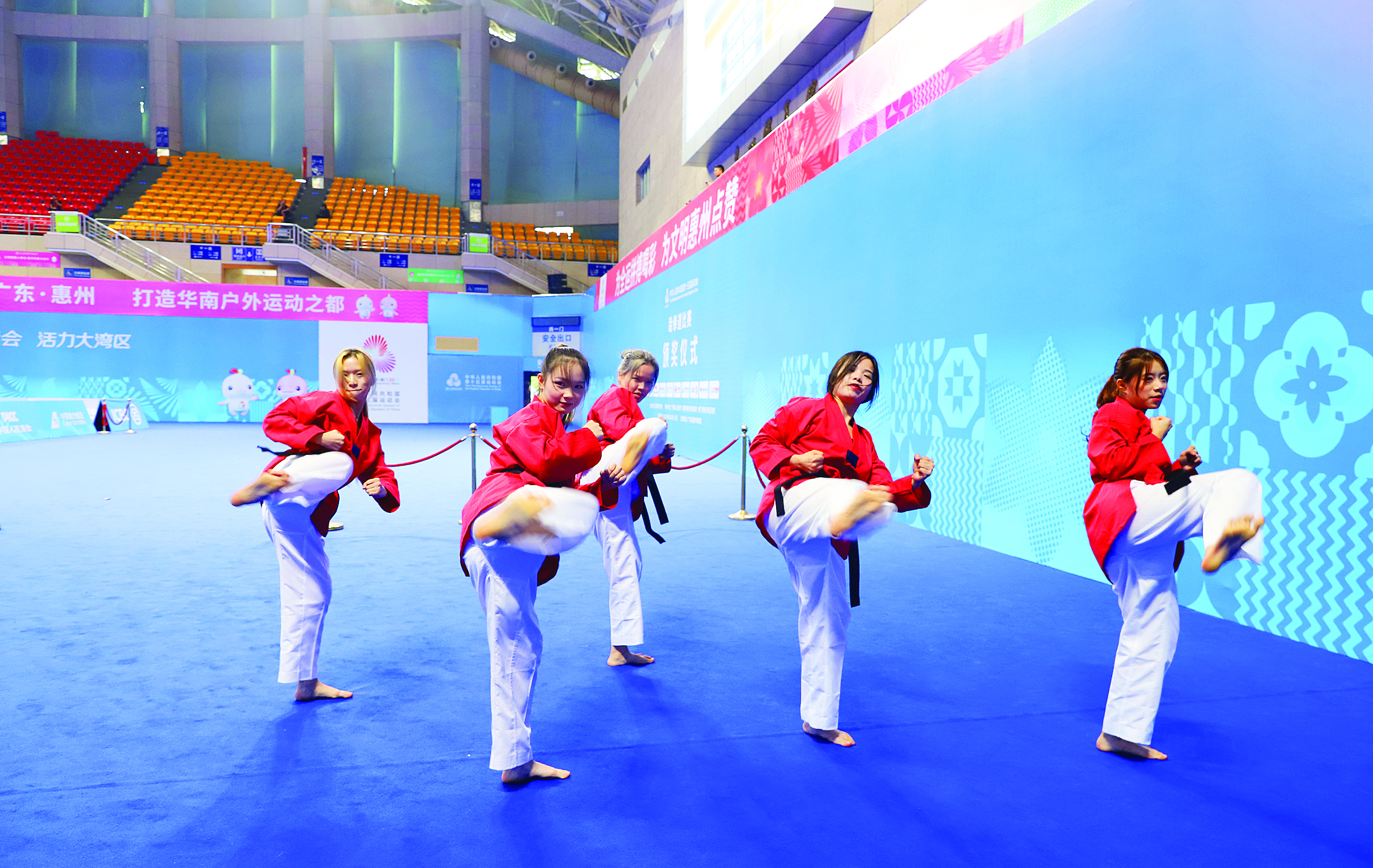 9月25日,惠州體育館十五運(yùn)會(huì)跆拳道比賽聯(lián)排現(xiàn)場(chǎng),體育展演在緊張排練。