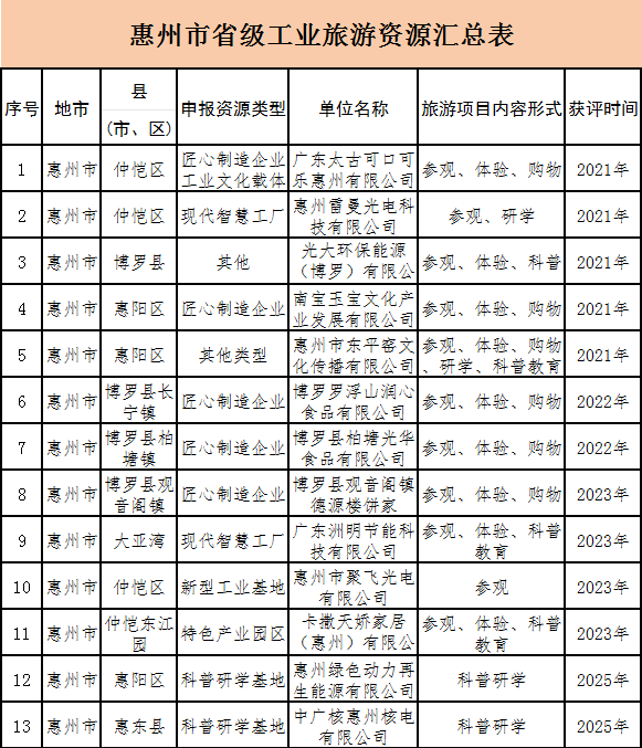 惠州作為“萬(wàn)億工業(yè)大市”,制造業(yè)發(fā)達(dá),產(chǎn)業(yè)鏈條完整,工業(yè)門(mén)類(lèi)豐富,為工業(yè)旅游這一新興業(yè)態(tài)的發(fā)展提供了廣闊空間;葜莨I(yè)旅游資源豐富,涵蓋科技感滿滿的電子信息產(chǎn)業(yè)、傳統(tǒng)家具、制鞋、服裝產(chǎn)業(yè),以及豆腐花、糕點(diǎn)等非遺制作技藝傳承企業(yè)。這些資源幾乎覆蓋了與市民息息相關(guān)的衣食住行各領(lǐng)域。