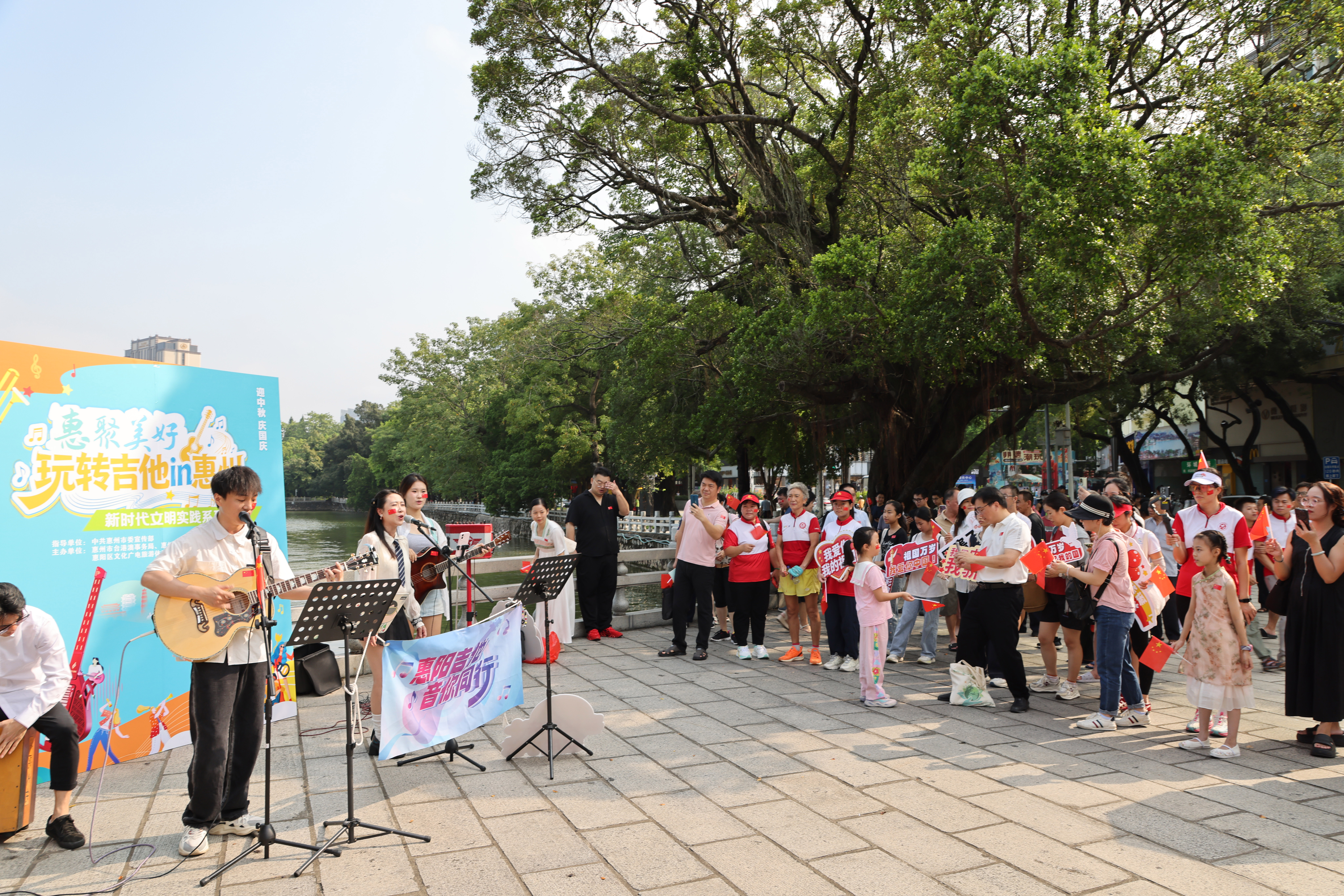 這是“惠聚美好”新時代文明實踐活動——“玩轉(zhuǎn)吉他in惠州”國慶吉他快閃系列活動首場活動,吸引眾多市民游客參與,點燃國慶歡樂熱潮。