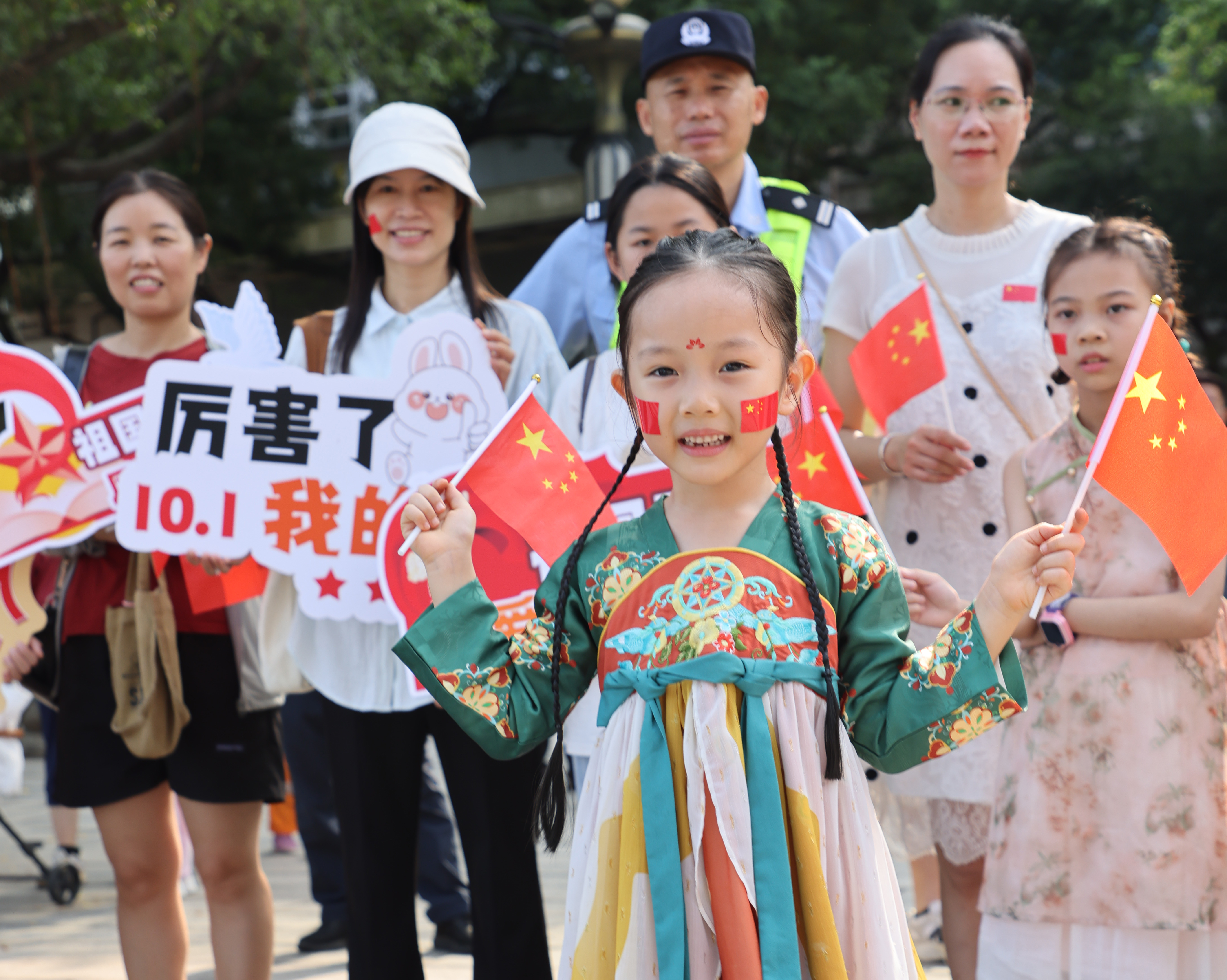 10月1日上午,惠州西湖風景名勝區(qū)紅旗飄飄,與山水風光交輝相映,國慶佳節(jié)到來之際,市民游客揮舞著手中的國旗,絡繹不絕前來觀光游玩。平湖門入口前,《我和我的祖國》歌曲響起,在愉悅的吉他聲中,大家伴著熟悉的旋律,高聲歌唱起來,音樂與愛國情懷激情碰撞,共同祝福祖國繁榮昌盛。