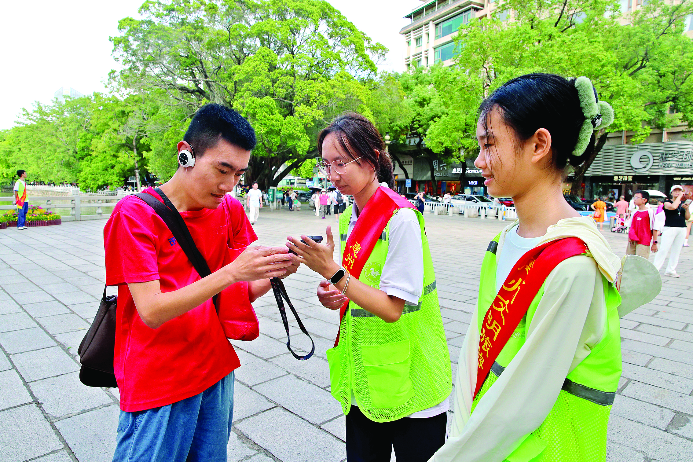 10月5日,惠州文明旅游志愿者在西湖景區(qū)服務游客。 惠州日報記者鐘暢新 攝