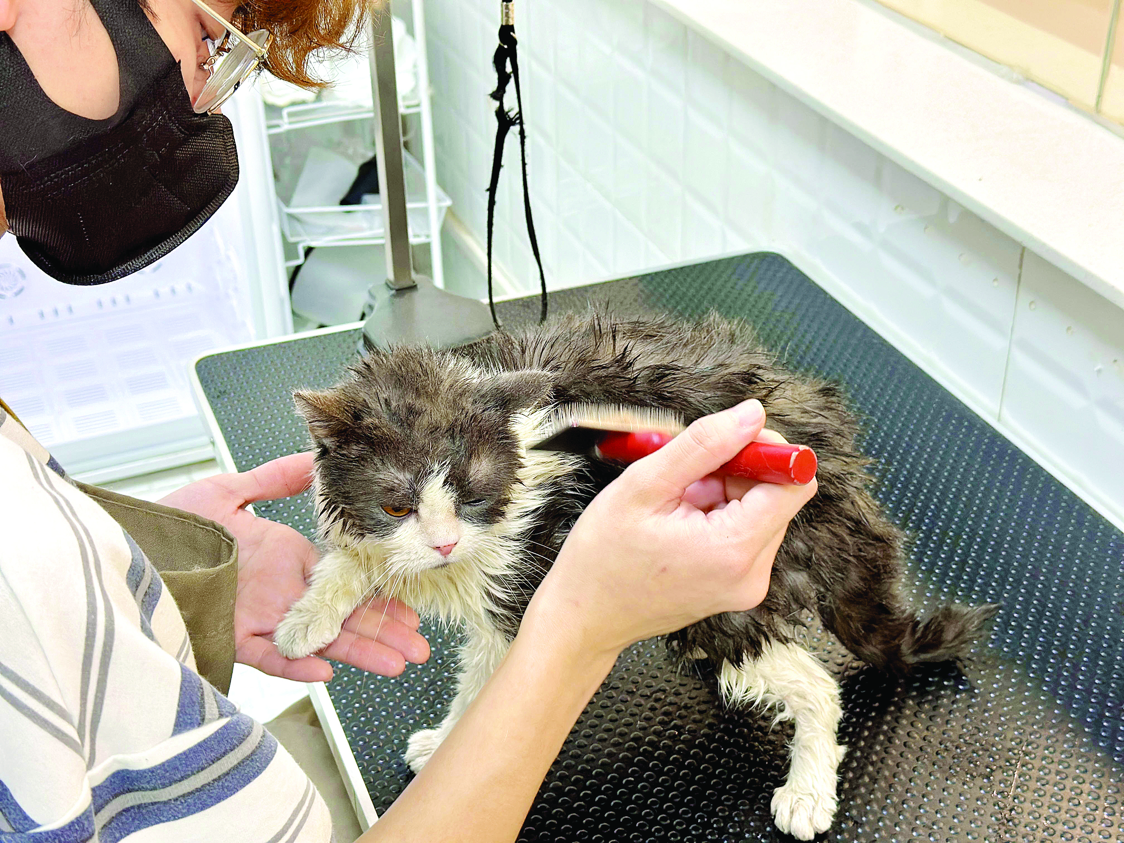 寵物生活館工作人員在為寄養(yǎng)萌寵做洗護;葜萑請笥浾哂舞 攝
