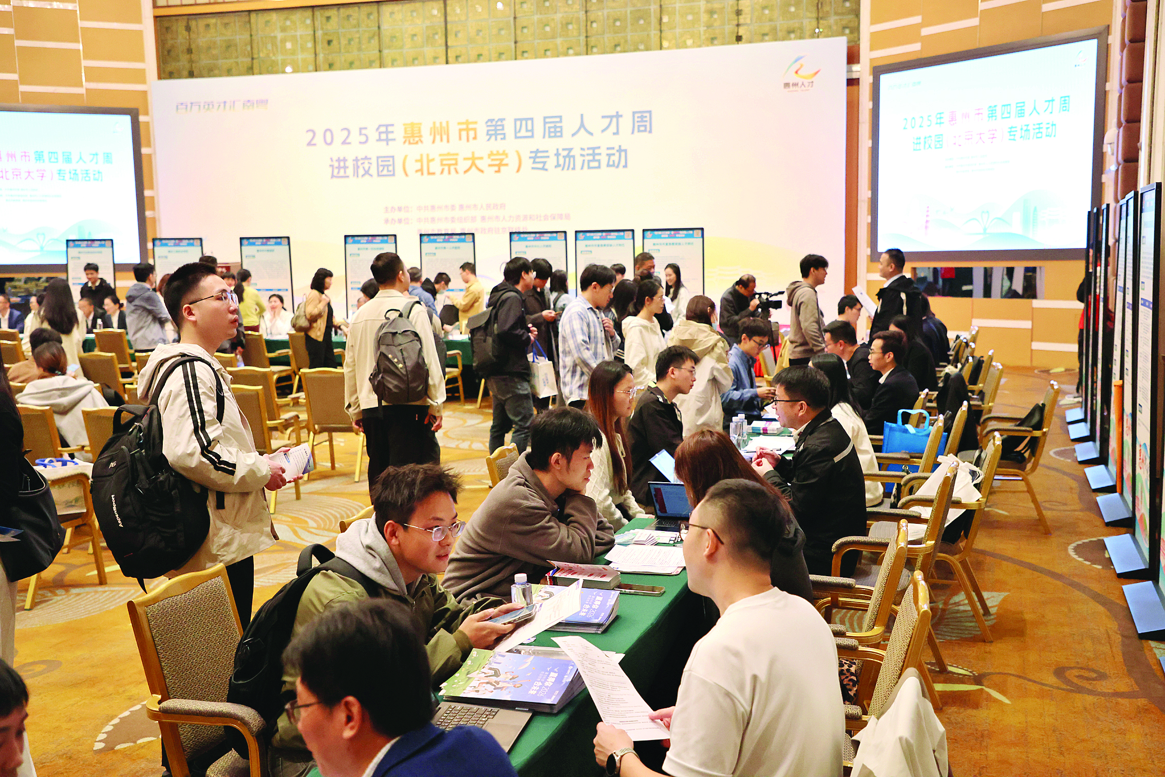 10月15日,由市委、市政府主辦,市委組織部、市人力資源和社會保障局、市教育局、市政府駐京聯(lián)絡(luò)處承辦的“百萬英才匯南粵”暨2025年惠州市第四屆人才周進(jìn)校園(北京)專場活動走進(jìn)北京大學(xué)。圖為我市民營企業(yè)招聘的崗位受到了北大學(xué)子的青睞;葜萑請笥浾咄踅 攝