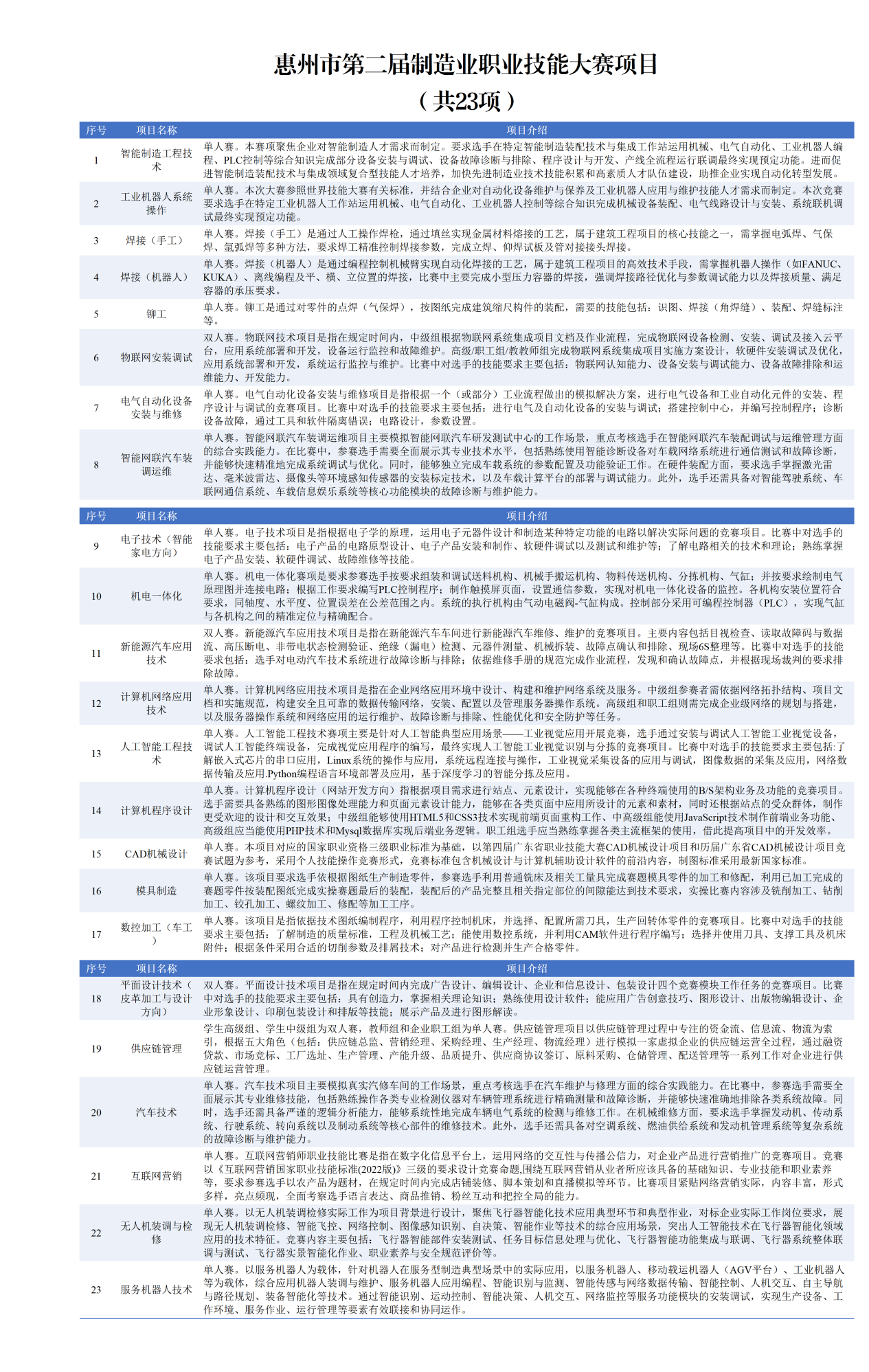 大賽緊密圍繞我市制造業(yè)當(dāng)家戰(zhàn)略,聚焦制造業(yè)與電子信息產(chǎn)業(yè)、新能源與新型儲(chǔ)能產(chǎn)業(yè)、數(shù)據(jù)中心、未來產(chǎn)業(yè)與新興產(chǎn)業(yè)、傳統(tǒng)產(chǎn)業(yè)轉(zhuǎn)型升級(jí),共設(shè)置23個(gè)競(jìng)賽職業(yè)(工種)或項(xiàng)目,覆蓋惠州重點(diǎn)發(fā)展產(chǎn)業(yè)集群。