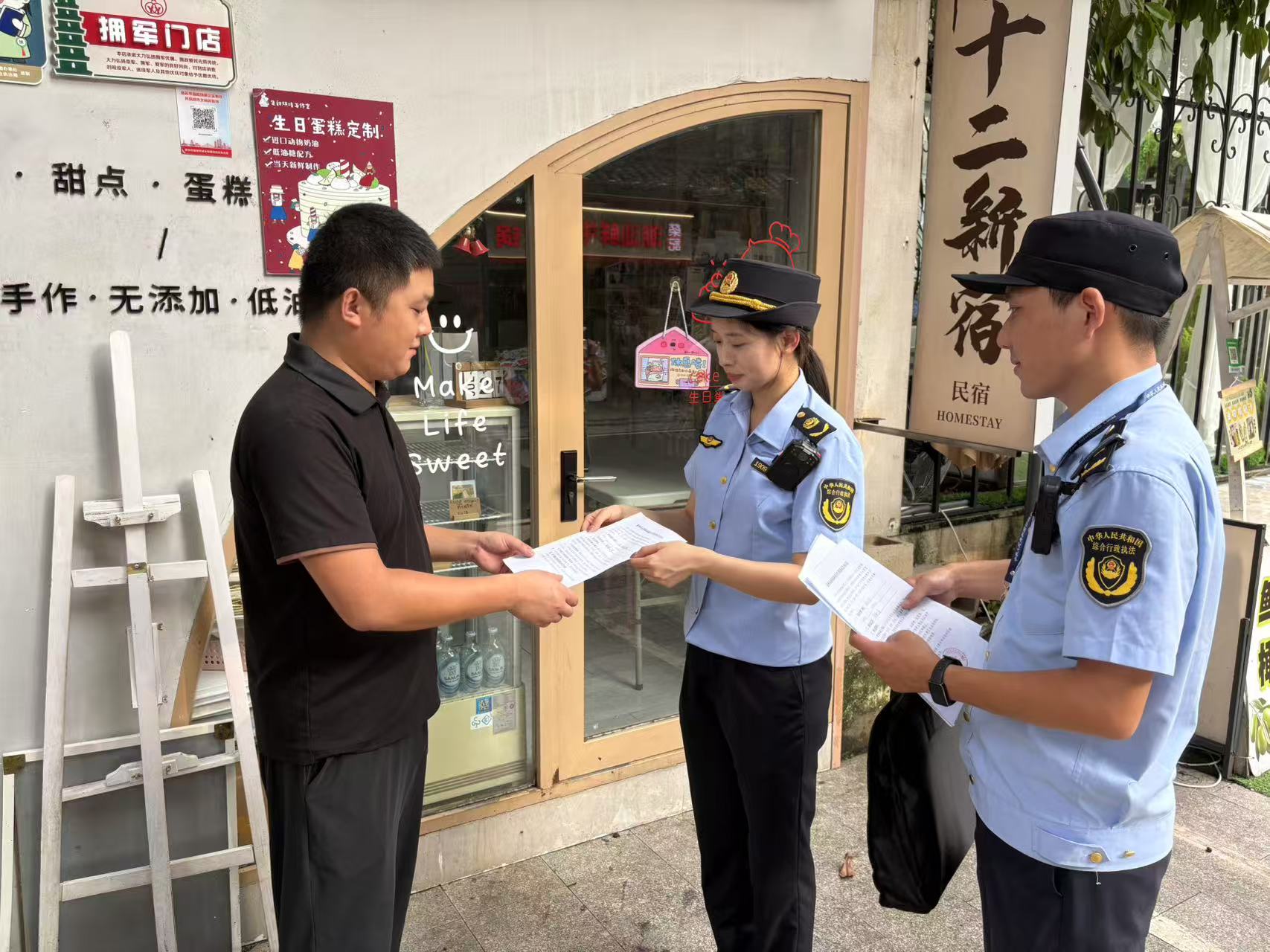執(zhí)法人員向商戶派發(fā)資料。