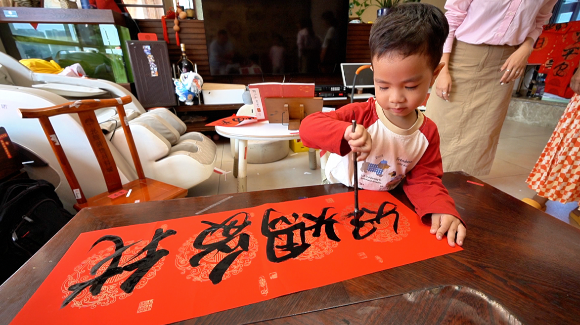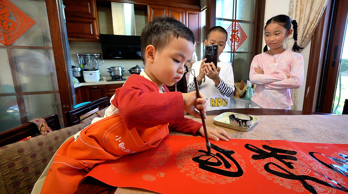 “吉祥如意好意來!”紅紙上,小手攥著毛筆翻飛,3歲的黃煊朗(小名朗朗)踮著腳站在椅子上,半個身子撲在餐桌前,蘸墨、落筆一氣呵成。雖握筆是幼齡寶寶常見的“握拳式”,但筆畫粗細有別、間架結構規(guī)整,寫完上聯寫下聯,最后補上橫批和“福”字,一套春聯“四件套”才算收尾——這份專注與功底,不僅讓央視《越戰(zhàn)越勇》的主持人連連驚嘆,更讓億萬網友直呼“文曲星下凡”。