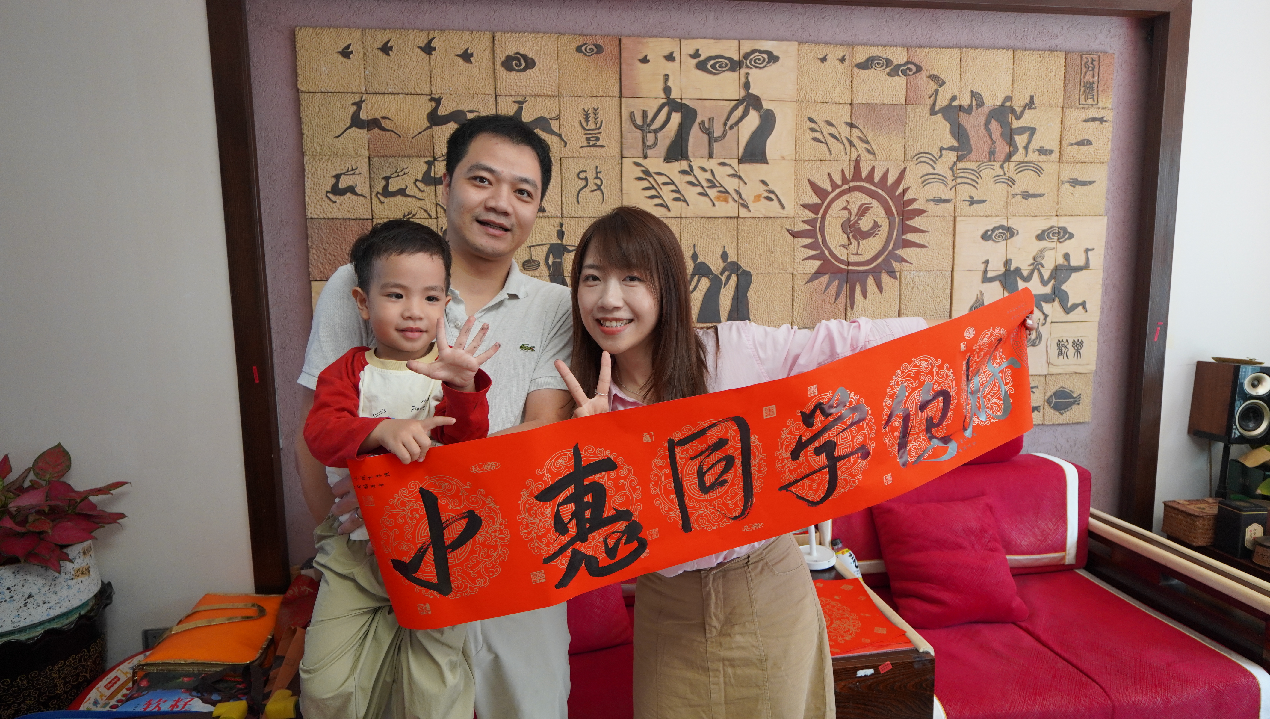 黃煊朗一家展示黃煊朗寫好的“小惠同學你好”橫幅。