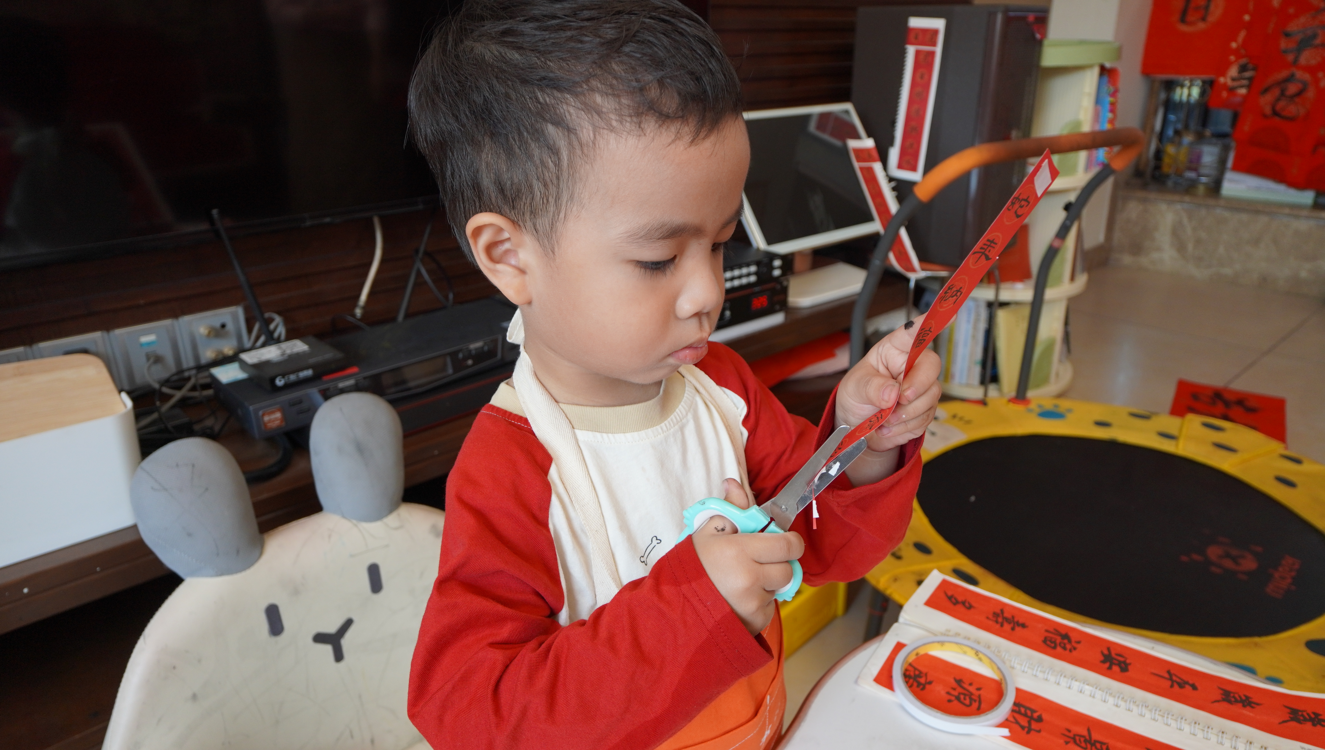 走進朗朗家,仿佛闖入了“對聯天地”:房門、柜子上貼滿對聯,地上鋪著他上午剛寫就的新聯,玩具架、餐廳扶手旁堆著厚厚幾疊對聯紙,客廳茶幾上常年擺放著文房四寶,隨時供他即興創(chuàng)作。初見記者時,這個長著小方腦袋系著小圍兜的萌娃還略有認生,摟著媽媽的脖子不放,但一會功夫,媽媽就把他哄來“寫春聯”。