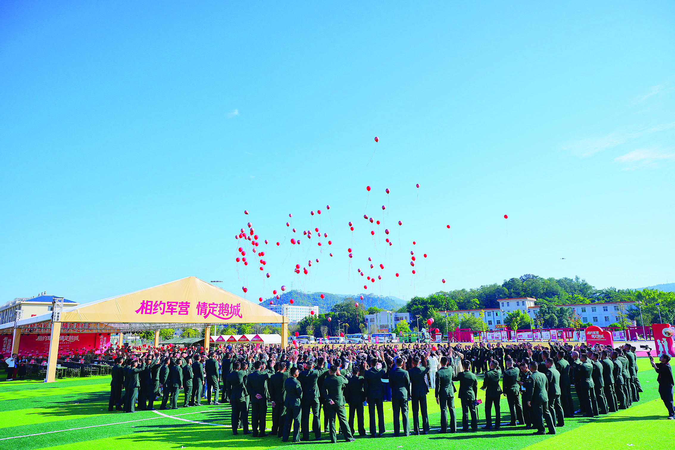 隨著一輛輛載著女嘉賓的“愛情大巴”緩緩駛?cè),軍地青年的甜蜜邂逅正式啟幕。官兵們早已整齊列隊(duì),形成專屬通道,女嘉賓從中緩緩走過時(shí),一聲聲整齊洪亮的“歡迎,歡迎,熱烈歡迎”響徹營區(qū)。大家紛紛被這份軍營特有的莊重與熱情感染,臉上洋溢著燦爛的笑容。操場上,官兵們在場地中央圍成一個(gè)碩大的“心形”,女嘉賓步入其中,形成“心心相印”。隨著一聲清脆指令,絢麗氣球應(yīng)聲騰空,上百只氣球在冬日暖陽下輕輕搖曳,將澄澈藍(lán)天裝點(diǎn)得浪漫非凡。