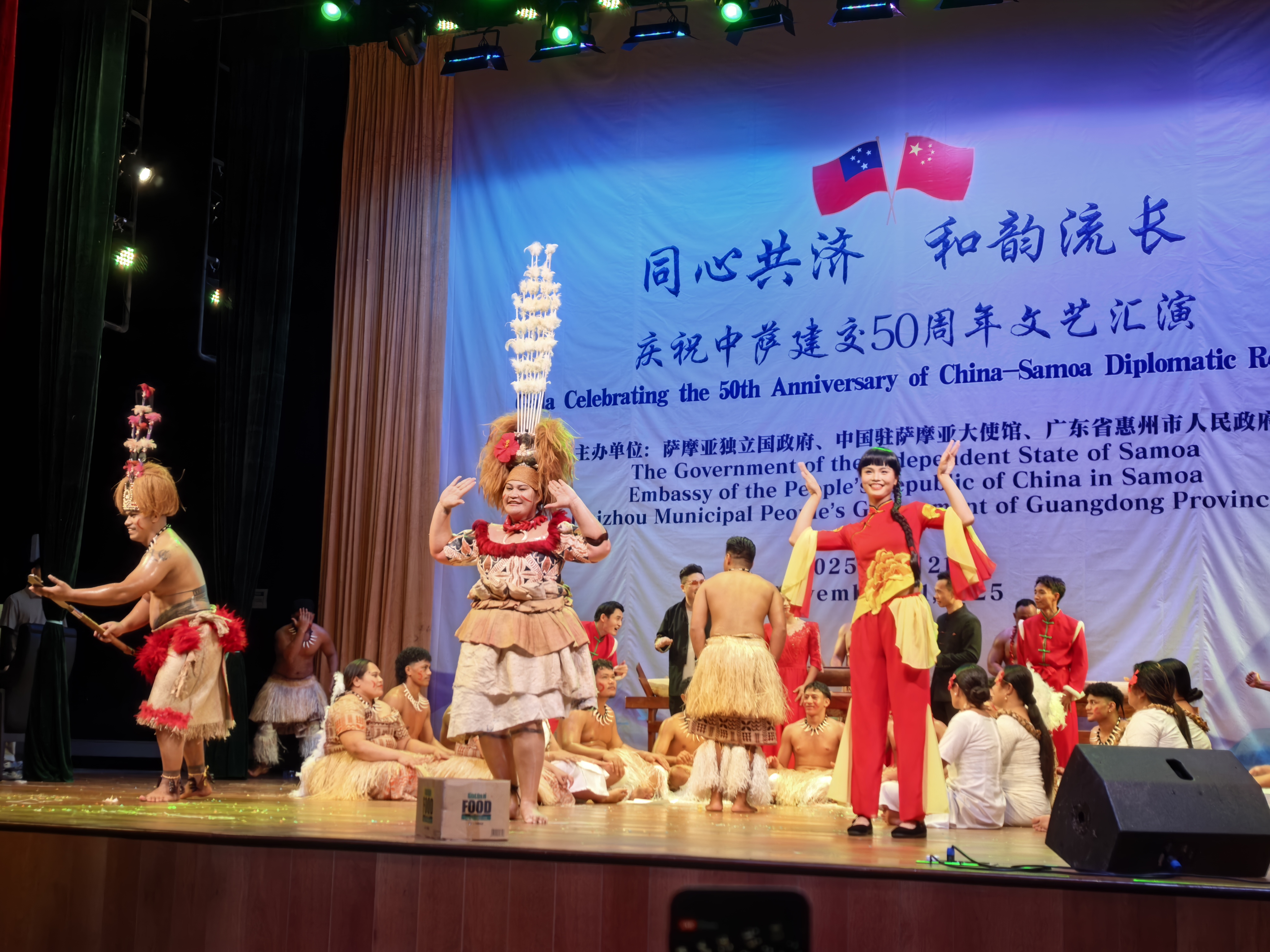 11月21日晚,“同心共濟(jì) 和韻流長”慶祝中薩建交50周年文藝匯演在薩摩亞文化藝術(shù)中心舉行。本次匯演由薩摩亞政府、中國駐薩大使館、惠州市政府聯(lián)合舉辦。