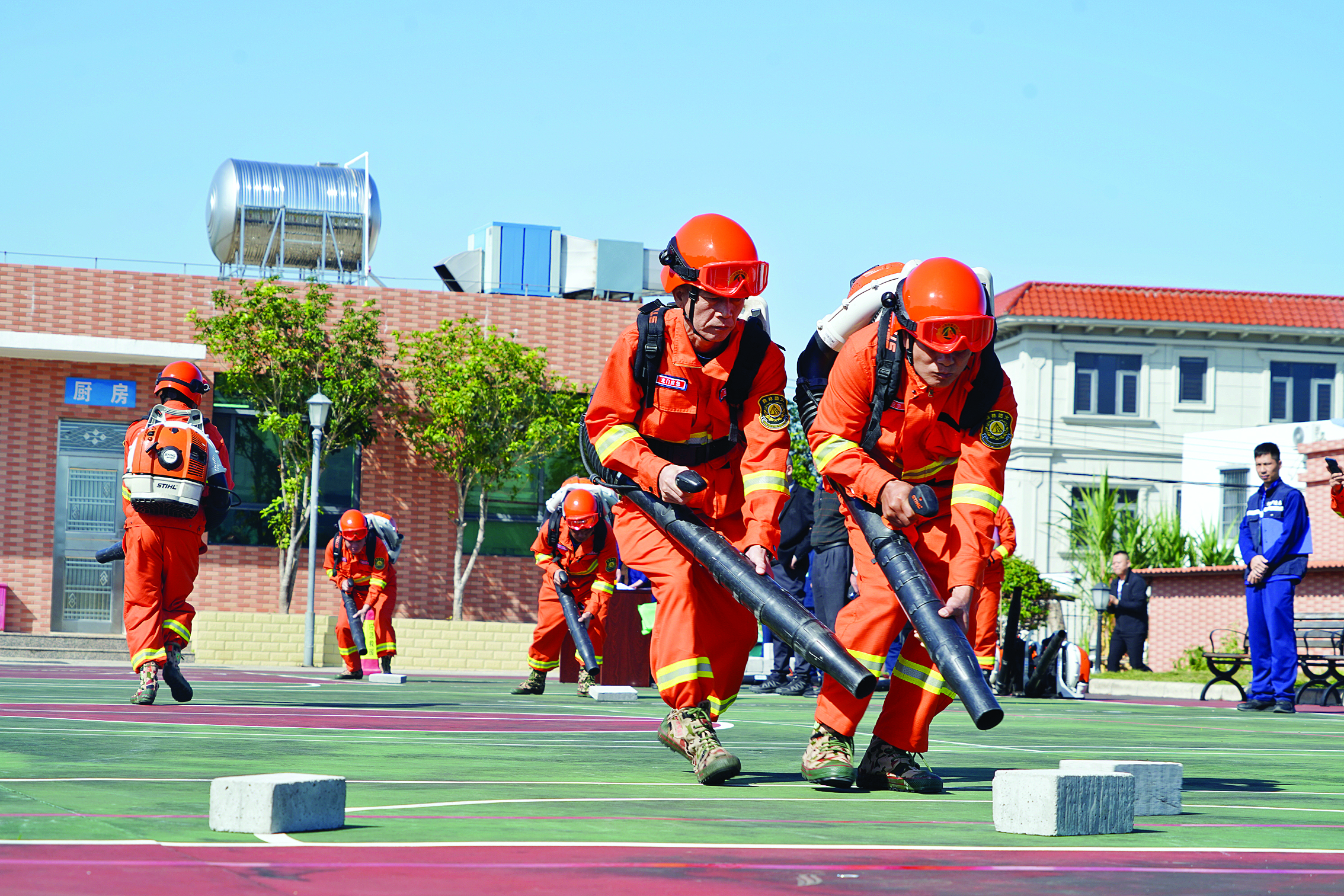 隊員參加風(fēng)力滅火協(xié)作戰(zhàn)術(shù)比武;葜萑請笥浾呃钏蓹(quán) 攝