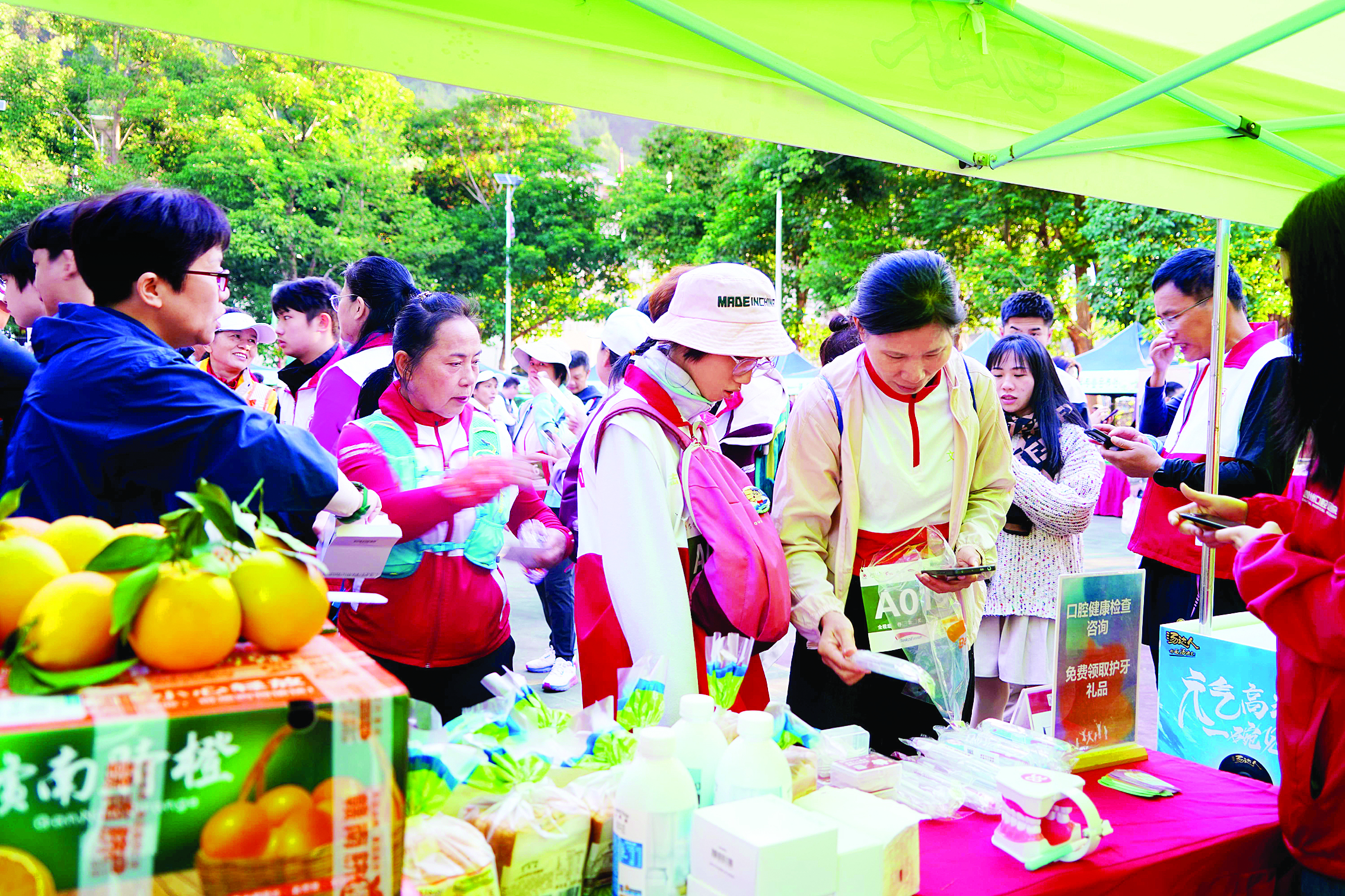 參加活動的徒步愛好者在領(lǐng)取物資;葜萑請笥浾呃钏蓹(quán) 攝