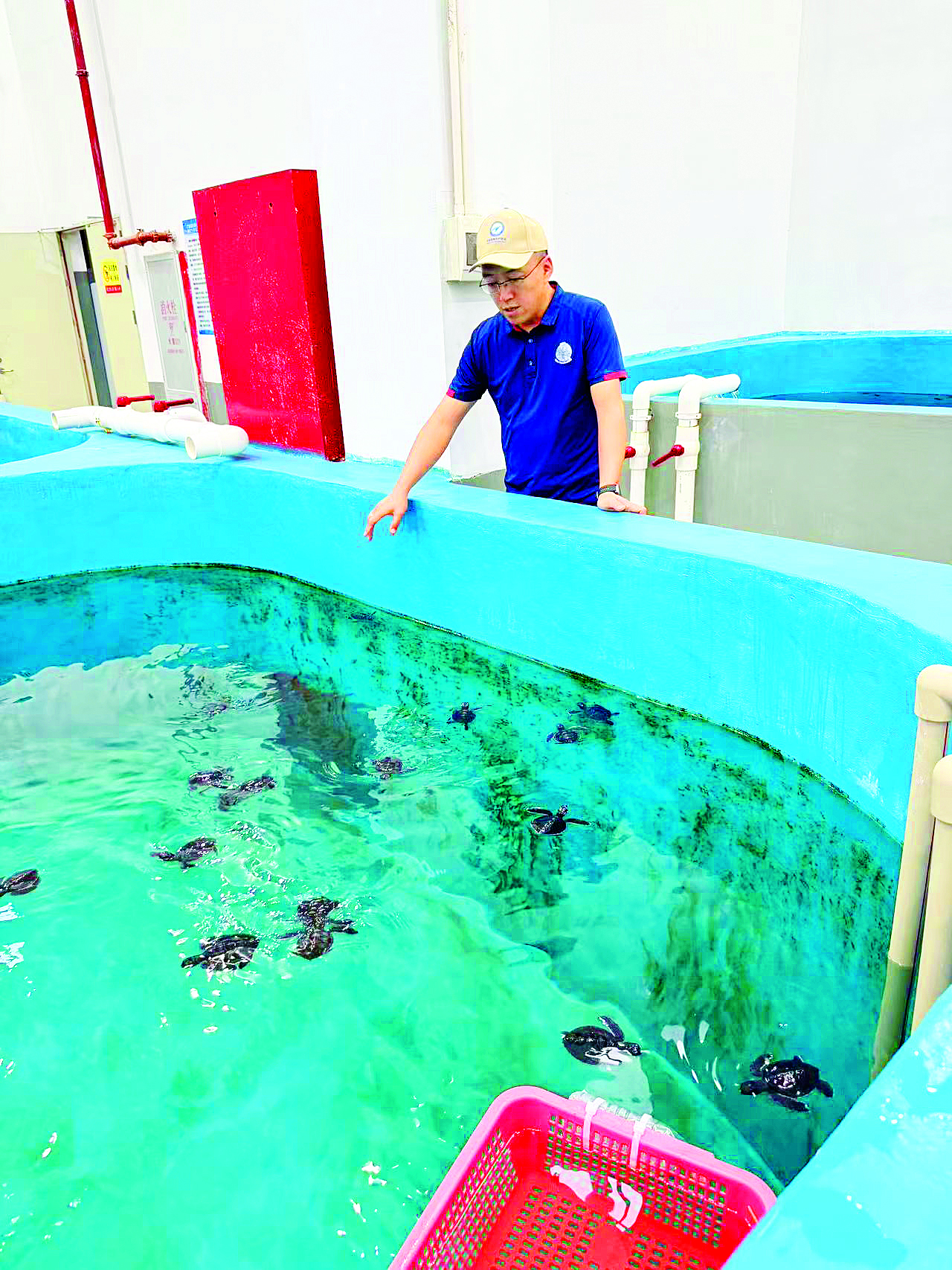 這位備受海龜歡迎的男子名叫肖定軍,是該海龜自然保護區(qū)技術科的一名工程師。非科班出身的他,憑著對海洋的一腔熱愛,自學成才,以技術手段提高海龜養(yǎng)殖效率,守護綠海龜?shù)某砷L,可謂是名副其實的“海龜衛(wèi)士”。