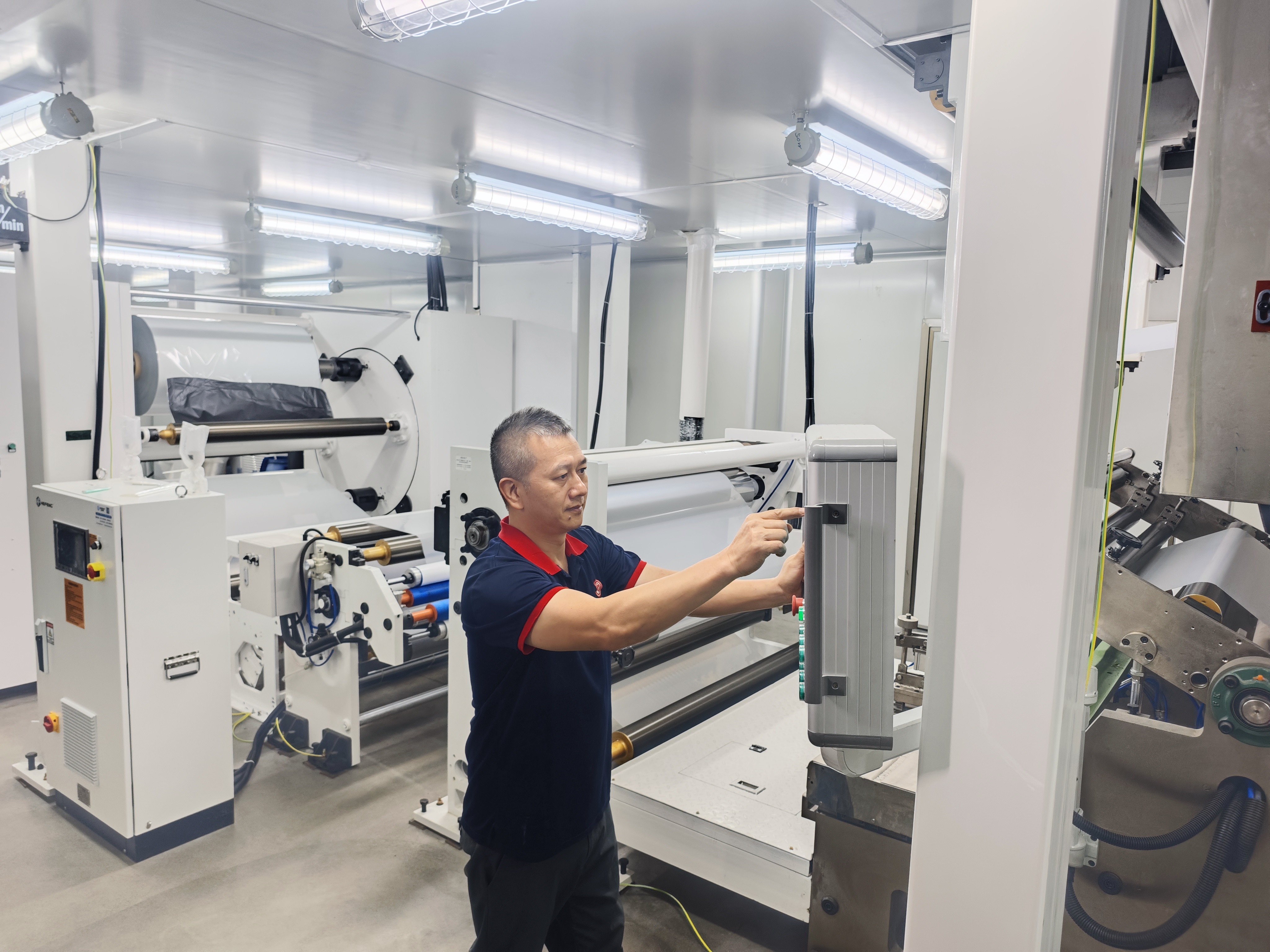 工人調(diào)試機器的各項參數(shù)后,經(jīng)過一系列工序,一張張薄膜被生產(chǎn)出來。