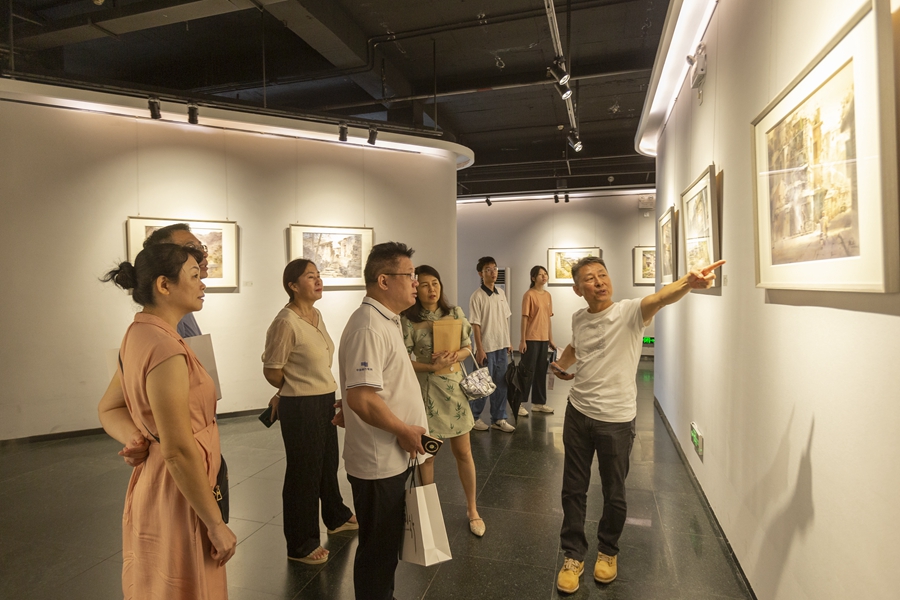 畫家成丹(右一)向觀展人員介紹自己的作品;葜萑請笥浾邔m曉磊 攝