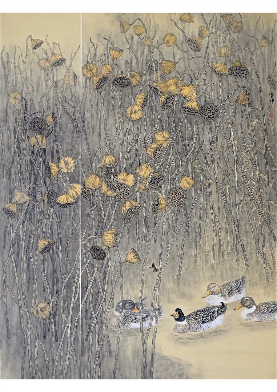 “很多畫家都專研于某一領(lǐng)域,而我,更喜歡挑戰(zhàn),選擇跟隨自己當(dāng)下的興趣,隨性創(chuàng)作!绷钟ぬ岬,作畫題材太雜其實(shí)是畫家的大忌,許多畫家傾其一生專研一種題材。但他從不給自己設(shè)限,不拘泥于某一題材或風(fēng)格。他曾在黃山之巔感受山之峻美,揮毫潑墨繪黃岳;也曾駐足荷塘之畔感受秋荷的風(fēng)骨素凈之美,以即將干枯的荷葉蓮蓬為題材創(chuàng)作《秋歌》;疫情期間,他見外賣小哥頂著疫情,不畏風(fēng)寒穿梭于大街小巷,創(chuàng)作出充滿人文關(guān)懷的《都市暖風(fēng)》。他的作品涉及花鳥、山水、人物等多個(gè)領(lǐng)域,但每一幅作品都充滿了生活氣息和時(shí)代感。