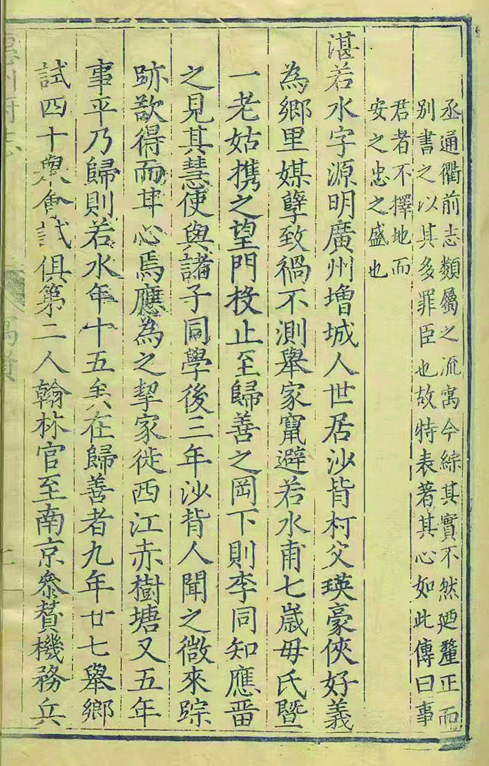 關(guān)于湛若水的童年經(jīng)歷,文獻中也有另一種說法。比如明代蔣冕撰《明封太孺人陳氏墓志銘》謂,“怡庵公(湛若水父親)既蚤世,太孺人孀居于母家,餐糲衣故,惟切切以教子為務”。顧鼎臣撰《慈母傳》亦謂,“家嘗中衰,怡庵又蚤世,孺人攜若水及諸女依母家以居,餐糲衣敝,日夜切切以訓子為事”。蔣冕和顧鼎臣均未提及湛母帶著湛若水避難惠州之事,僅是“依母家以居”。然湛母卒于明正德十年(1515),距離避難惠州時已過去四十余年,后人撰記時對這段記憶恐早已模糊。