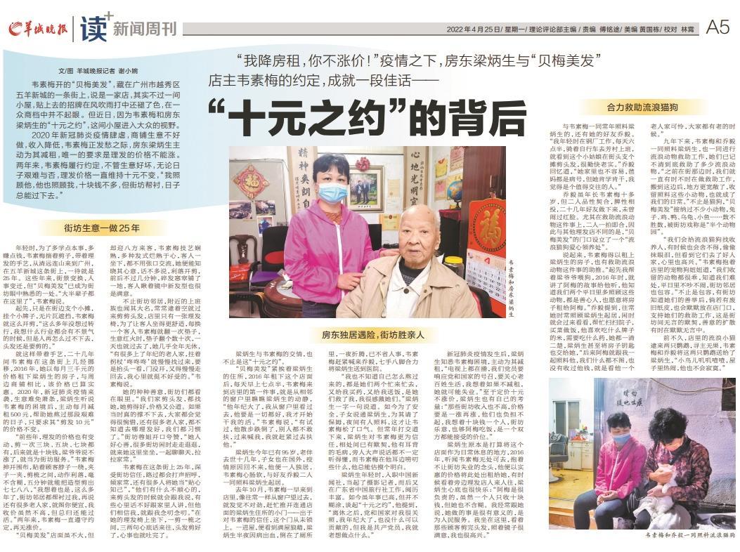 去年4月25日,羊城晚報(bào)曾刊發(fā)報(bào)道《“十元之約”的背后》,講述“中國(guó)好人”、誠(chéng)實(shí)守信理發(fā)師韋素梅與她的房東、“廣州好人”梁炳生守望相助、情暖街坊的故事。近日,韋素梅告知記者,自己的房東梁炳生先生已于2月2日凌晨去世,享年96歲。斯人已逝,情誼、諾言依舊。