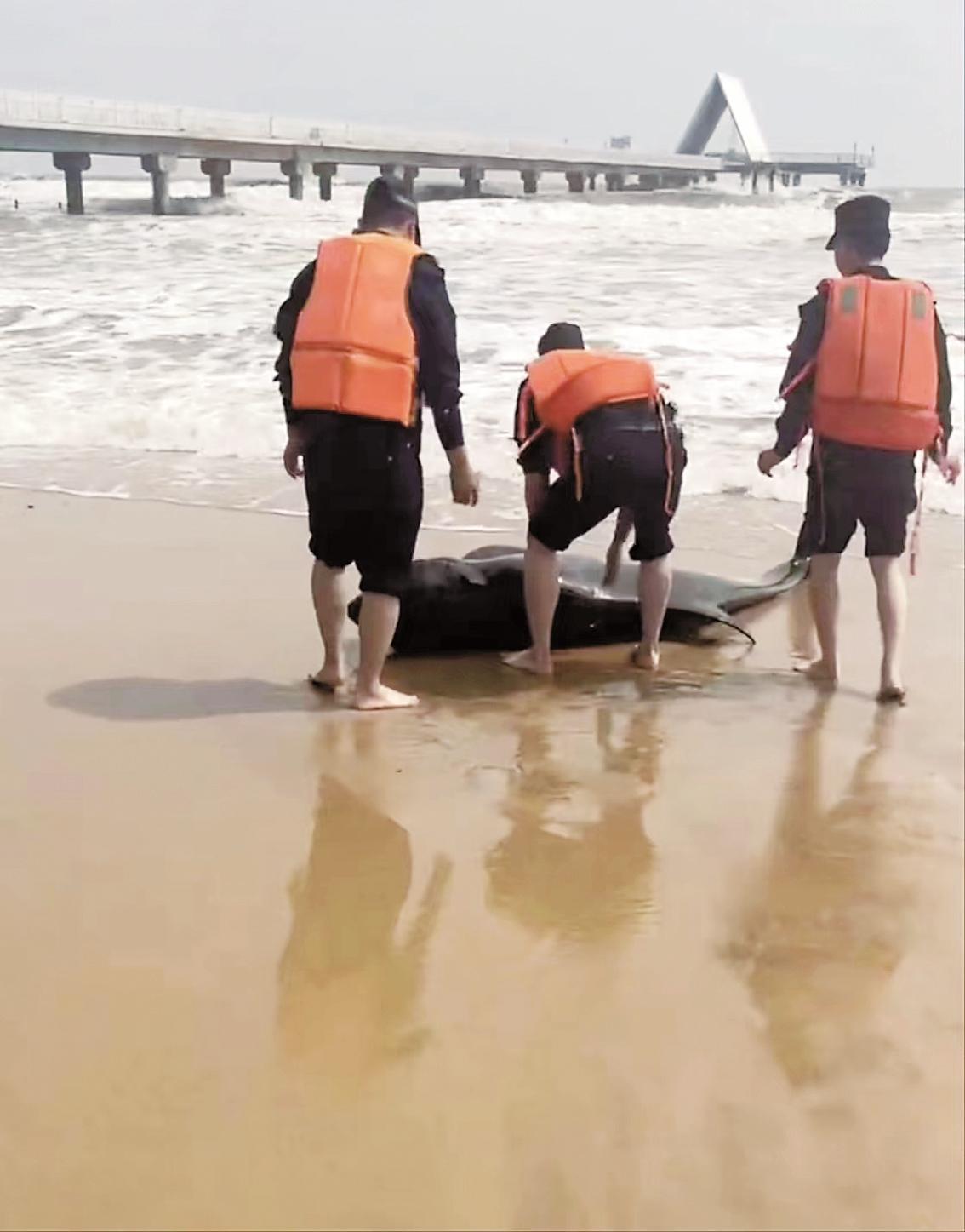 “鼎龍灣王村港海域有條大海豚擱淺,請趕快組織人員前來施救……”近日,湛江吳川市王村港鎮(zhèn)工作人員接到該市公安局110指揮中心轉(zhuǎn)來的信息后,立即組織10多人前往事發(fā)海域施救(見上圖),最終將海豚成功護(hù)送回大海。